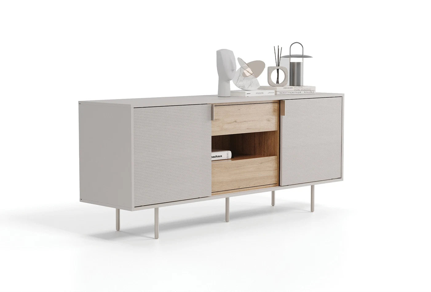 Привлича вниманието с модерния си и минималистичен дизайн и отразява елегантността си с комбинацията от естествен дъб и бежов цвят.