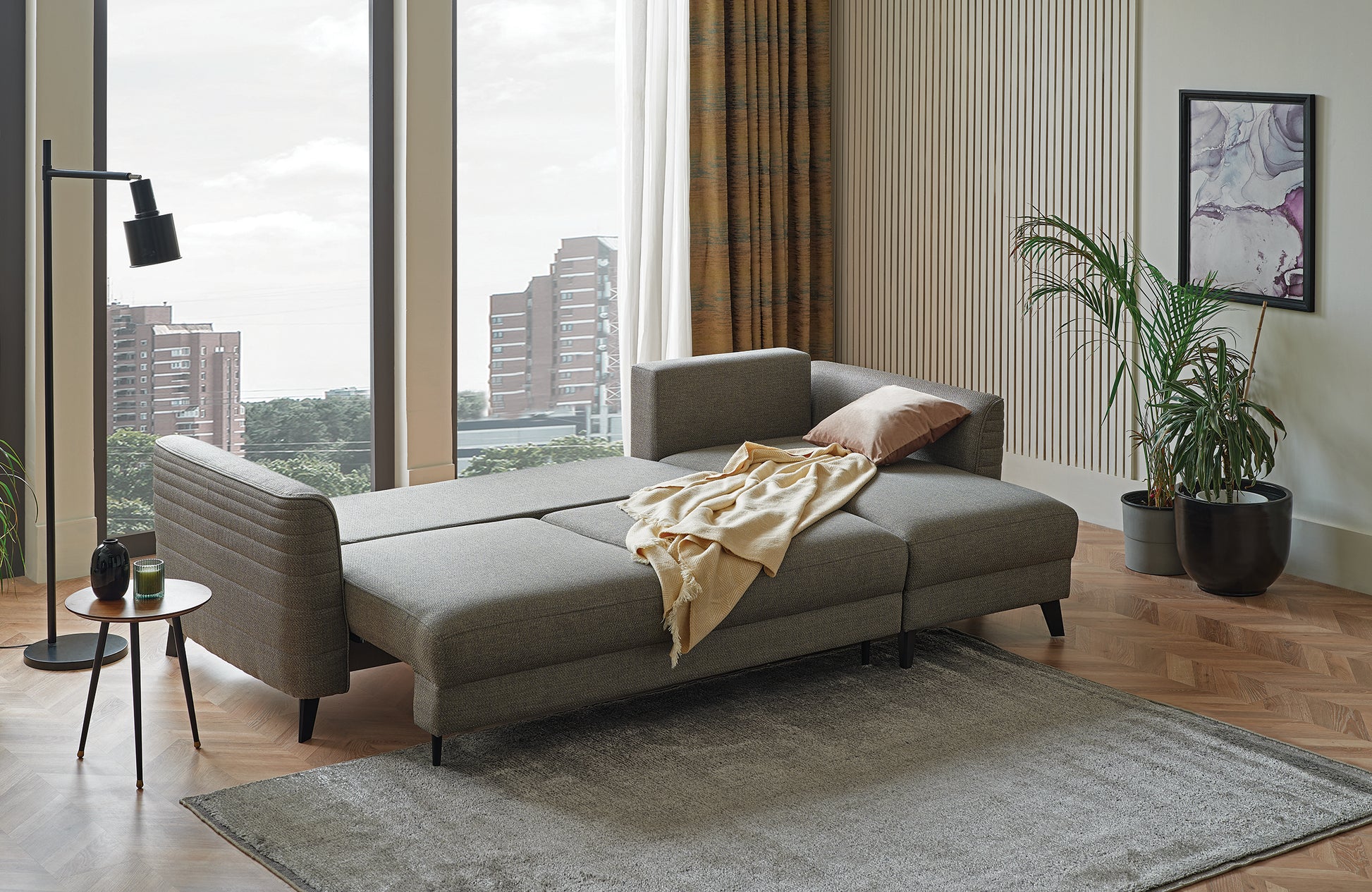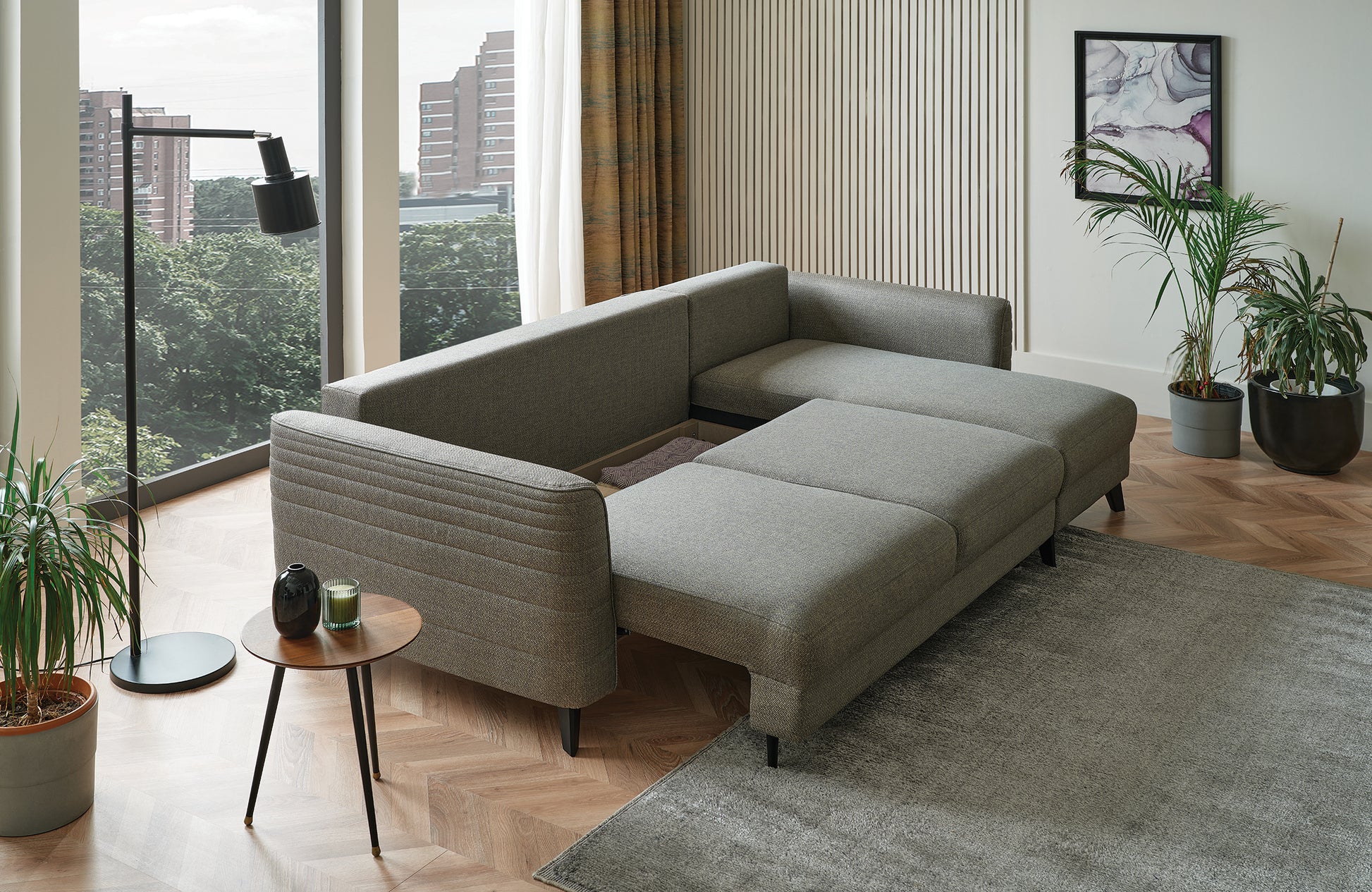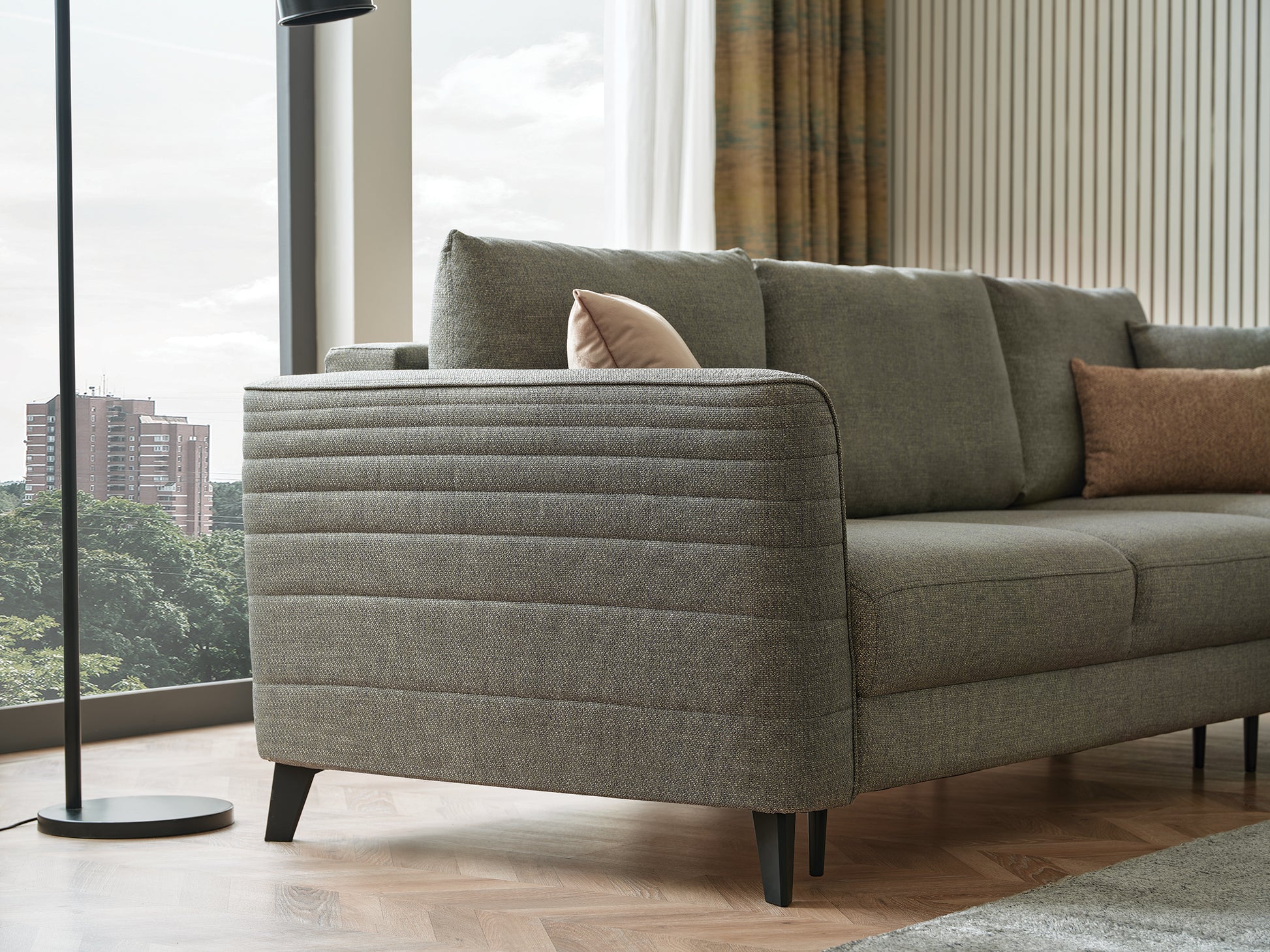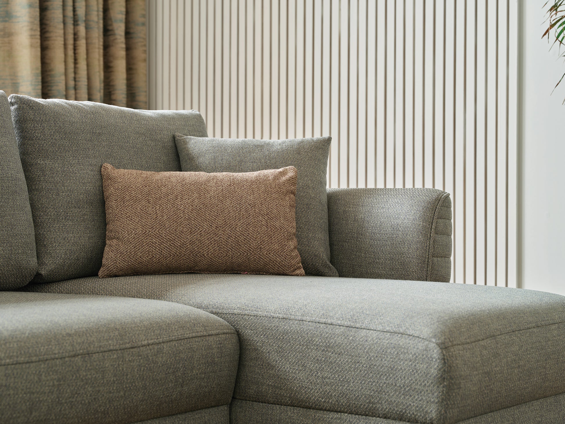 Ъглов диван Grace съчетава модерен стил на дизайн с многостранни функционални характеристики внасяйки стилна и практична интерпретация на концепцията за комфорт. Докато добавя стилна нотка към структурата на седалката, която дава приоритет на комфорта. Oтговаря на различни декоративни предпочитания с опции за цвят на краката - орех и черен.