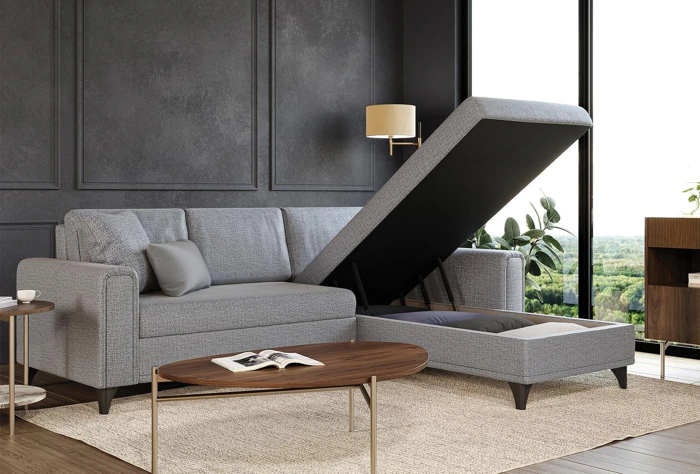 Ъгловият диван може лесно да се превърне в голямо легло, също така предлага допълнително пространство за съхранение .
