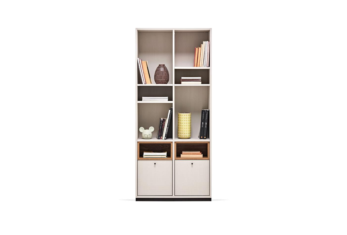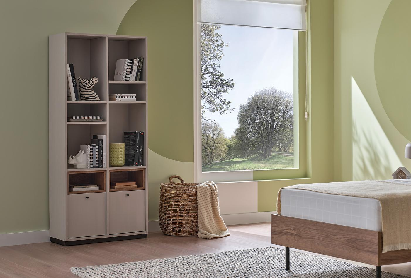 Допълвайки идеално мебелите с естествения си вид, библиотеката предлага стилно място за съхранение с динамичния си дизайн и дълбоко текстурирана повърхност на своите многофункционални отворени рафтове. Осигурява подходящо приложение за различни жилищни пространства със своите размери, които придават просторен вид на декорацията и се адаптират към почти всяка мебел. Имайки квалификацията да отговори на нуждите на младите, предоставя възможност за създаване на минимална и иновативна атмосфера. Улавяйки уникална хармония от комбинацията между цветовете светъл орех и крем се съчетава с дизайна на металната матова черна дръжка.
