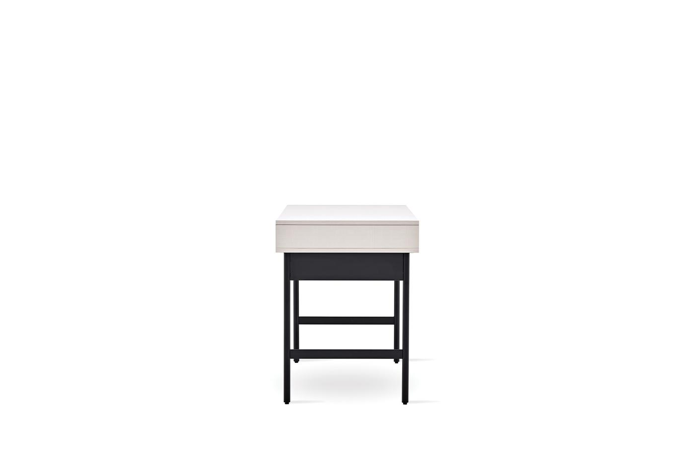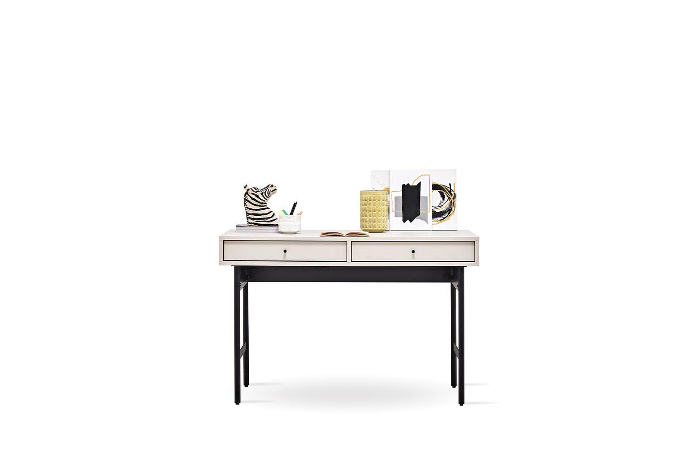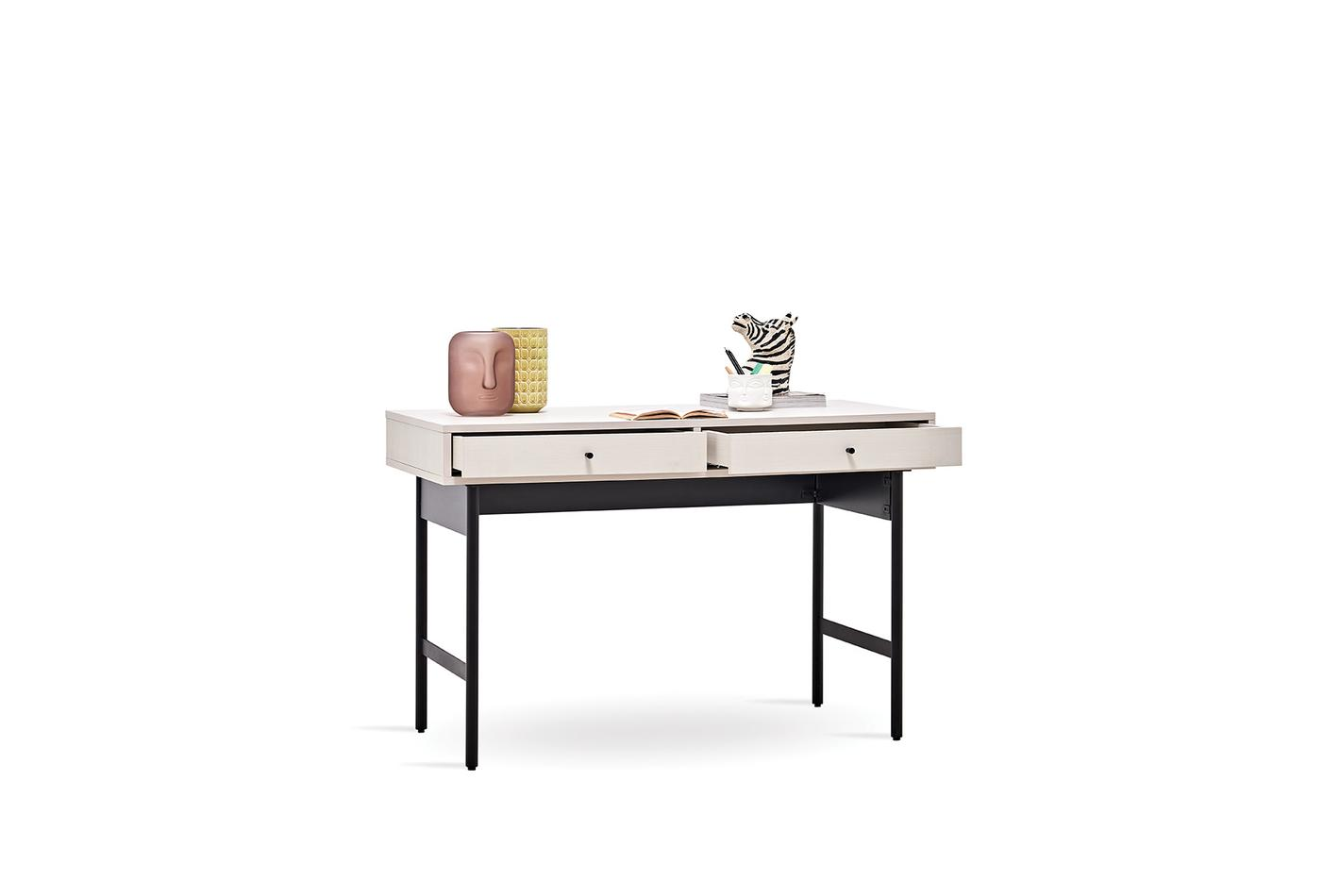 Предлага дълготрайна употреба, като съчетава модерния си вид, който идва от динамичния дизайн с качествения и издръжлив материал. Със своя модерен индустриален дизайн лесно се адаптира към всяко пространство, като същевременно предлага удобна употреба със своите метални матови черни крака. Приложението на 2 чекмеджета придава практичност и елегантност. Цветова комбинация от светъл орех и крем.