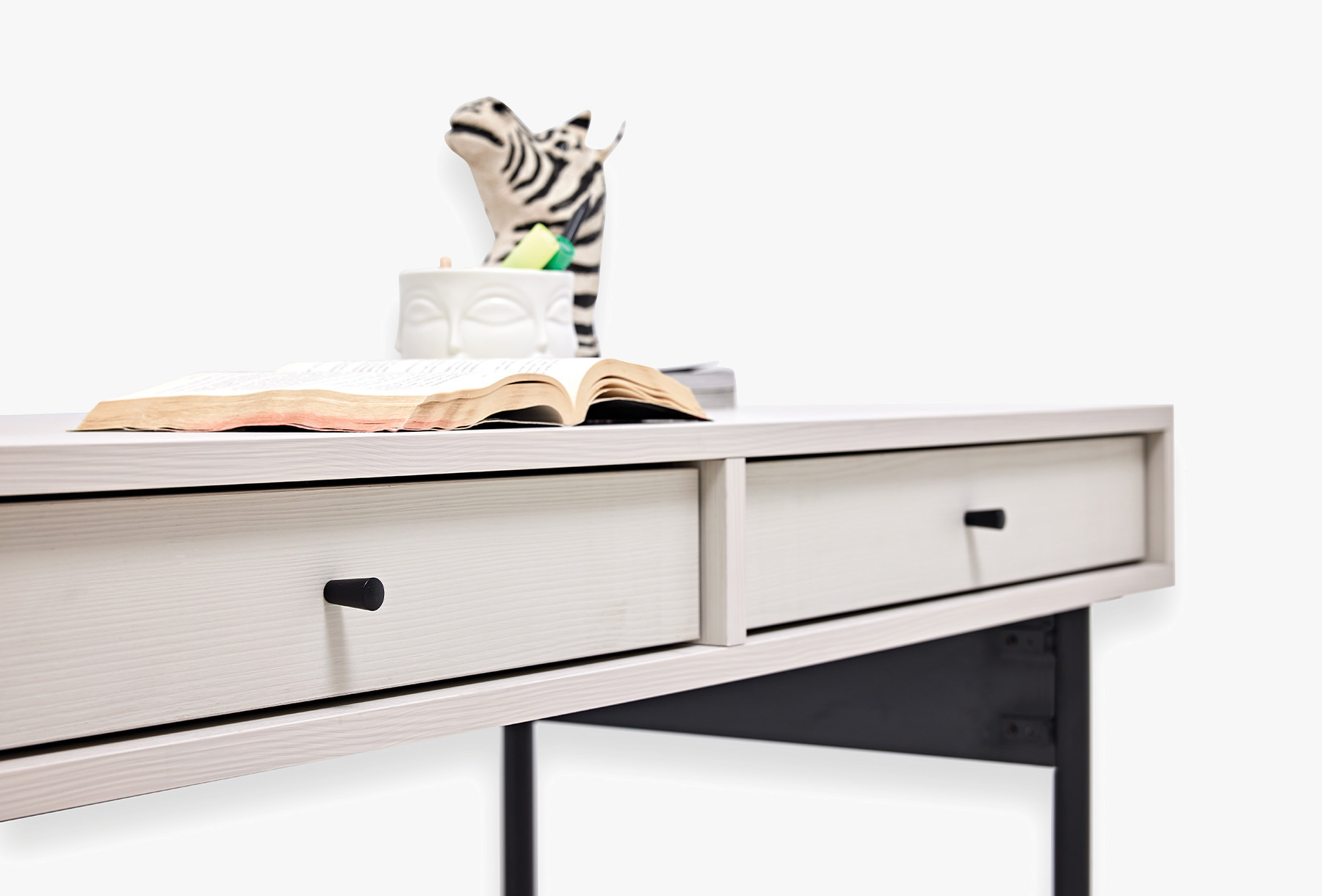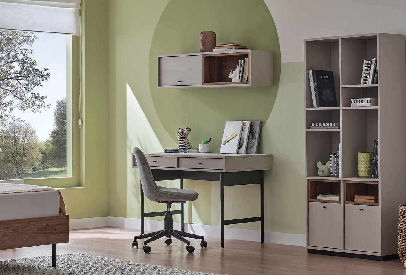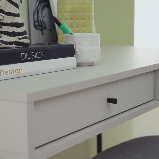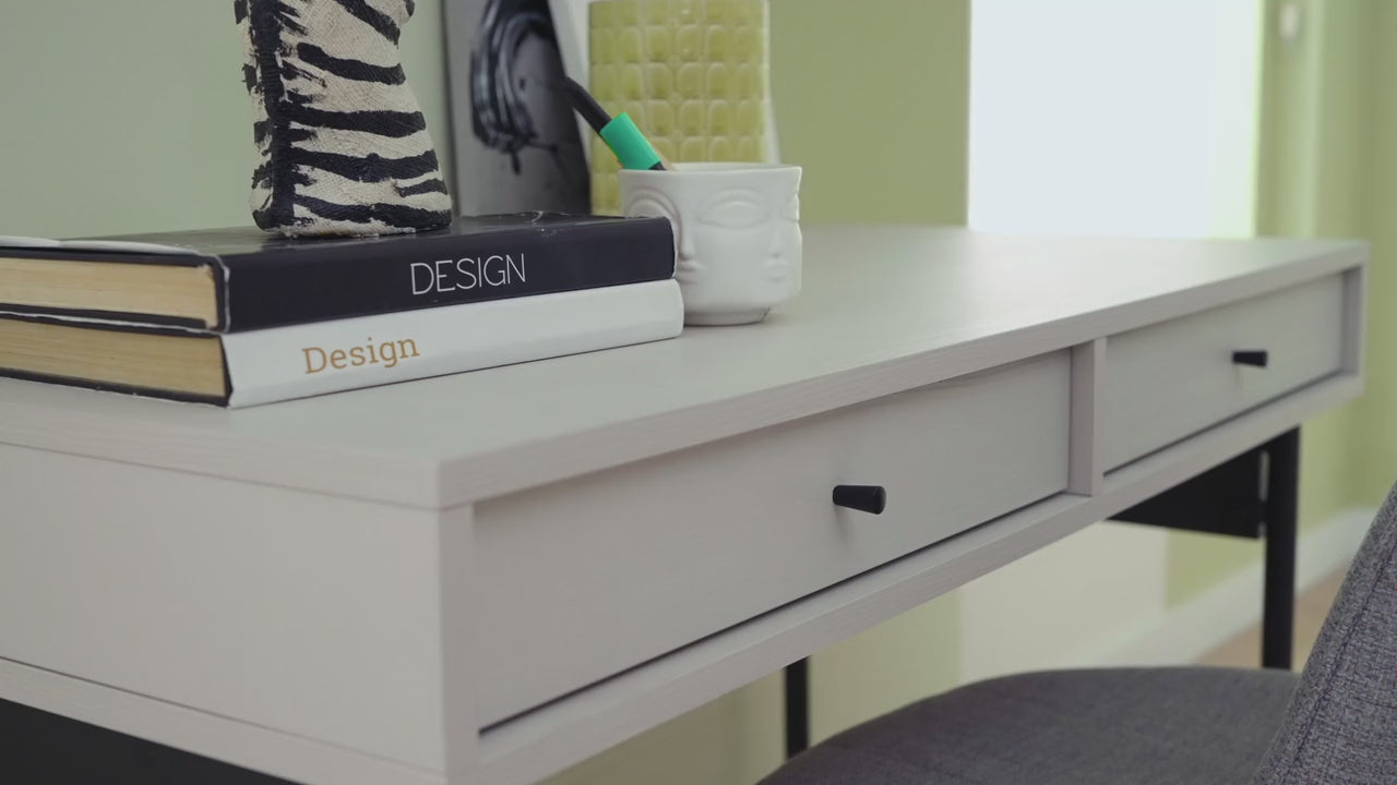 Предлага дълготрайна употреба, като съчетава модерния си вид, който идва от динамичния дизайн с качествения и издръжлив материал. Със своя модерен индустриален дизайн лесно се адаптира към всяко пространство, като същевременно предлага удобна употреба със своите метални матови черни крака. Приложението на 2 чекмеджета придава практичност и елегантност. Цветова комбинация от светъл орех и крем.