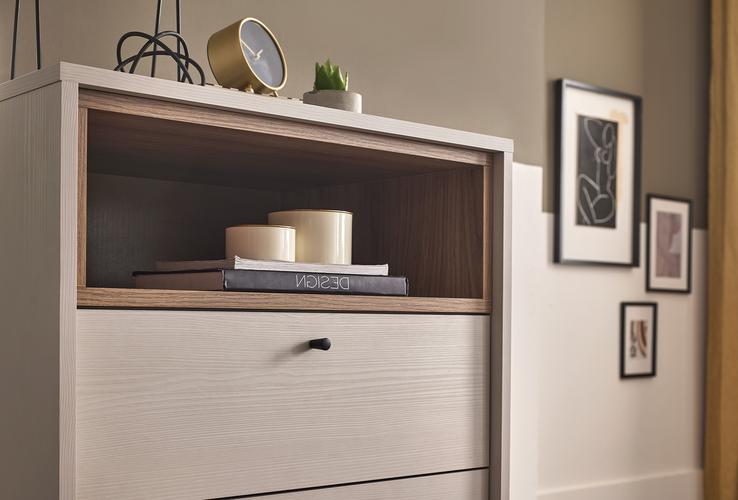 Комбинирайки естественост и иновативни детайли на декорацията, внася жизненост в пространствата. Използването на повърхност с дълбока текстура, където естествеността е на преден план, и метални матово черни дръжки добавят семпла и елегантна атмосфера към интериора. Със своя дизайн, отразяващ модерния индустриален стил, допълва жилищните пространства по най-добрия начин.