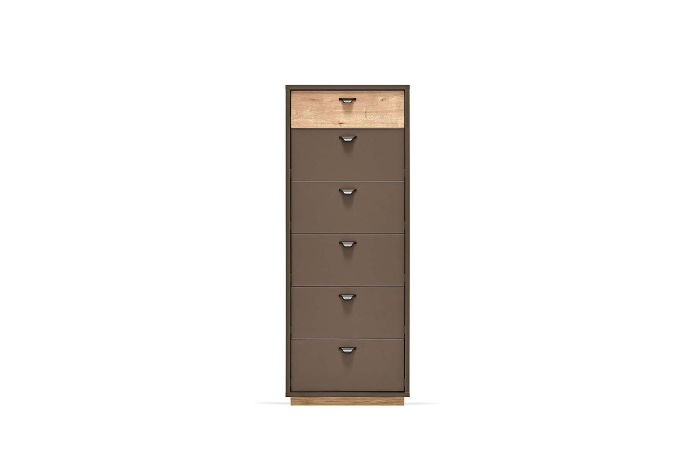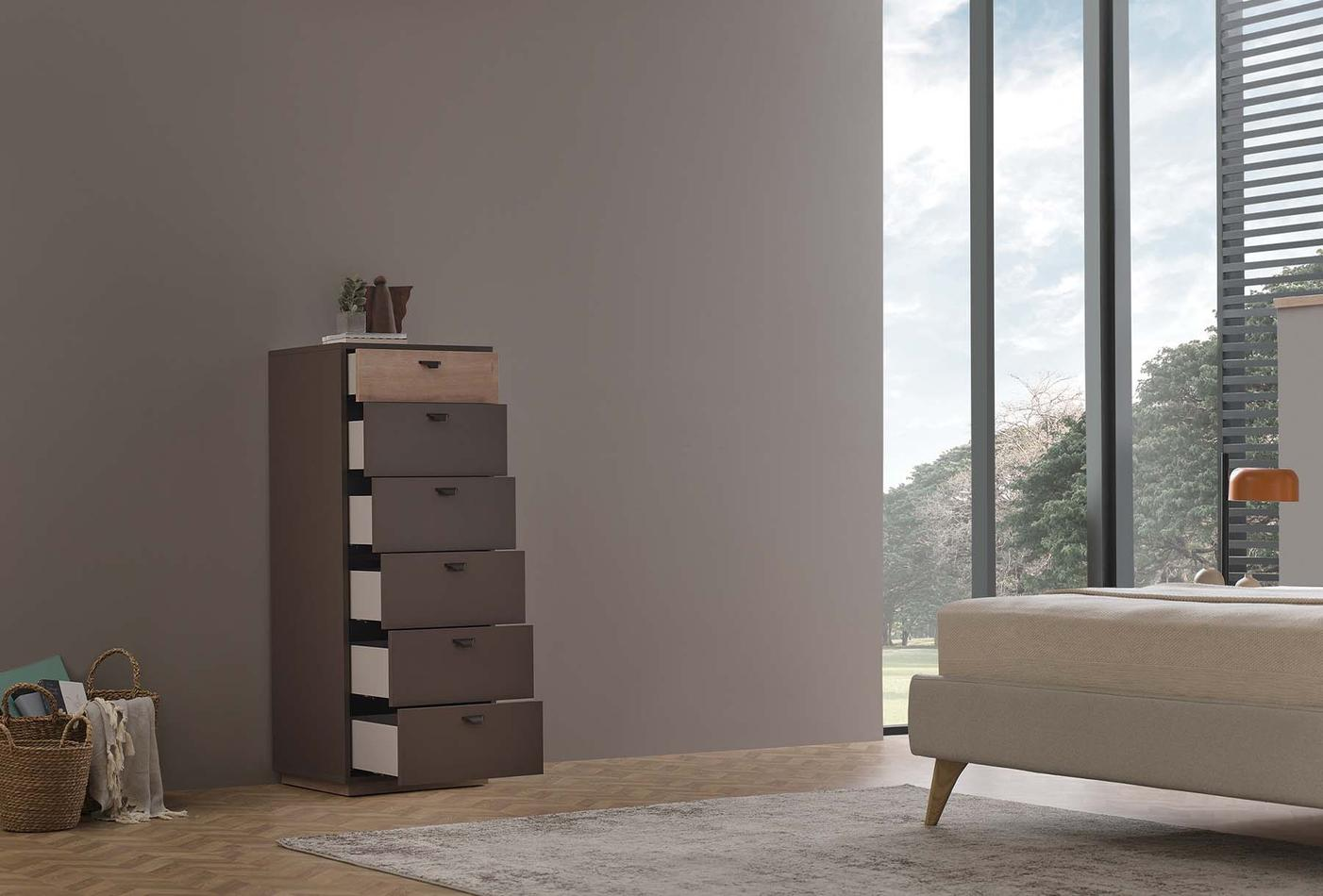 Шест чекмеджета с голям вътрешен обем идват заедно със спирачна релсова система, която можете да използвате лесно. Със своя ергономичен дизайн, скрин Polka ви позволява да използвате вашето жилищно пространство както желаете, като спестява място.