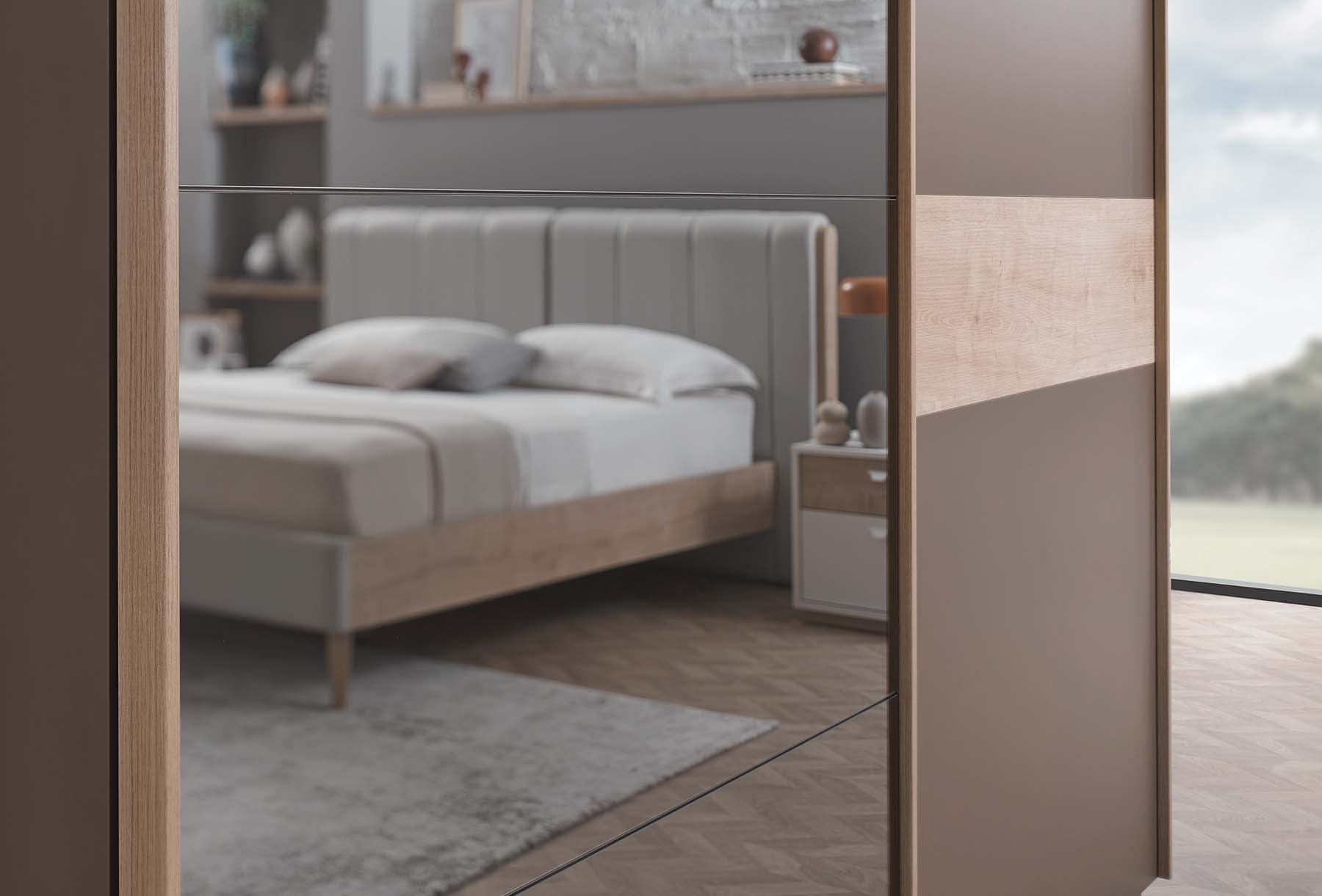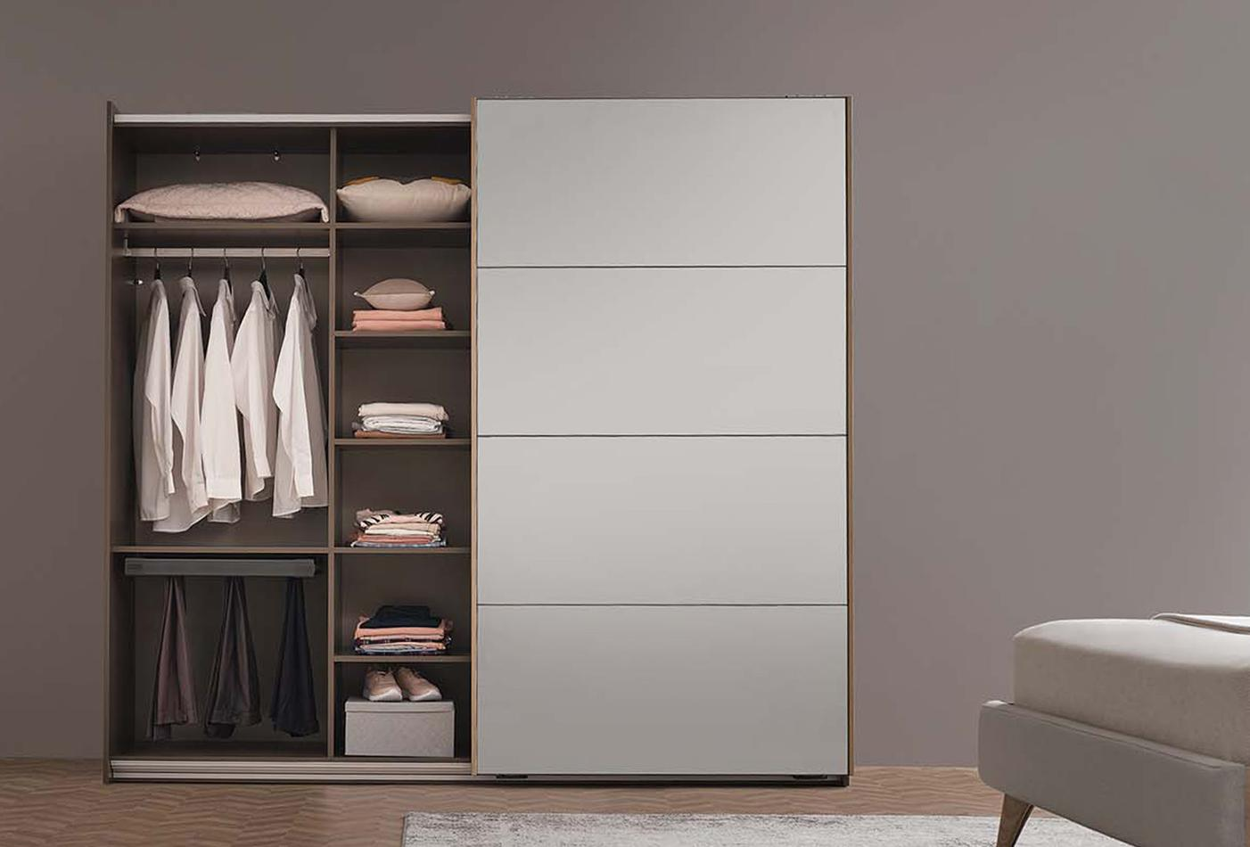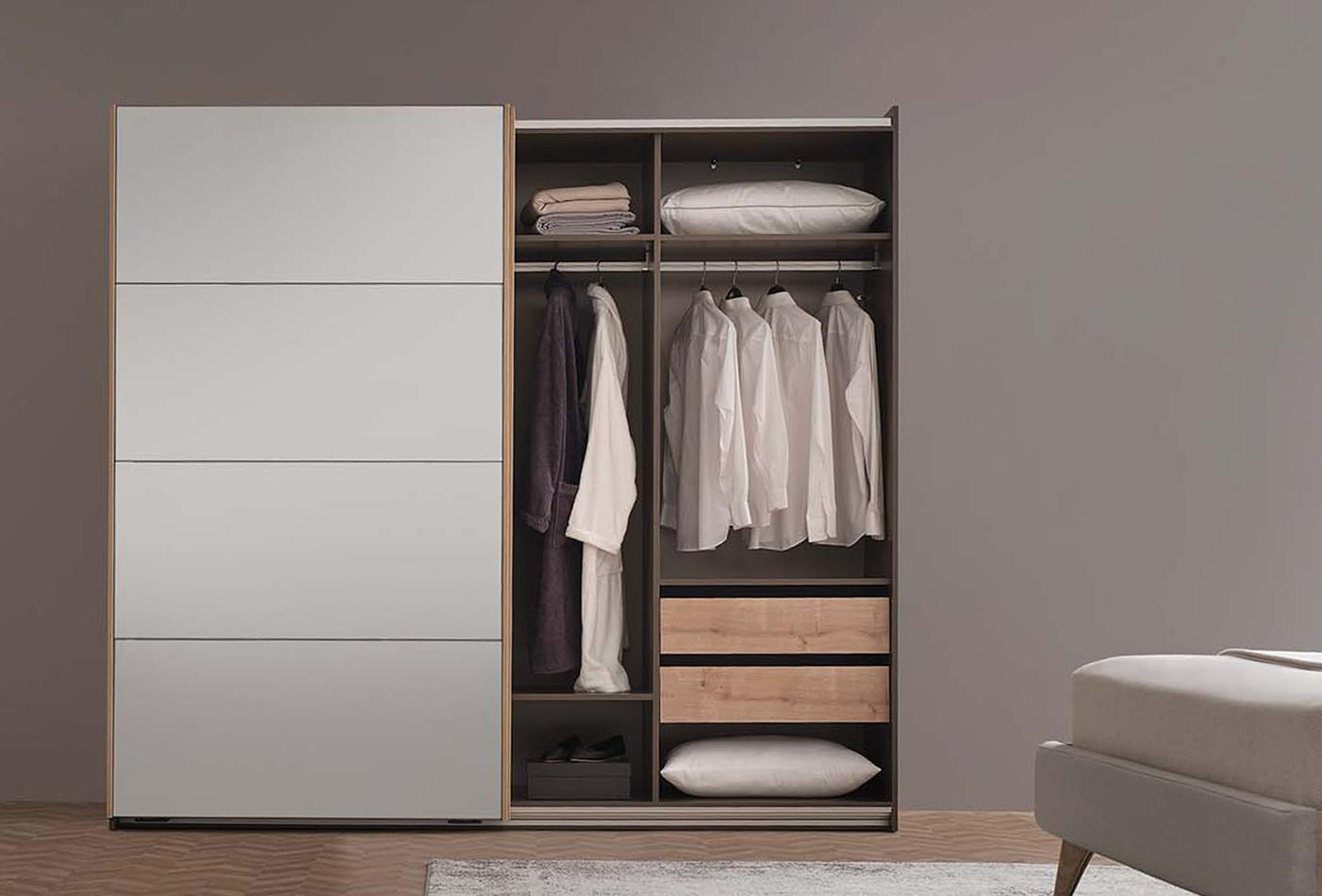 Благодарение на специалния си механизъм позволява безшумното и меко използване на скритата система за плъзгане. Този комфорт, подкрепен от бавна панта и система от релси се предлага с модерен стил, отразен в детайли като метални дръжки. Привлича вниманието с двете си чекмеджета и апликацията за панталони.