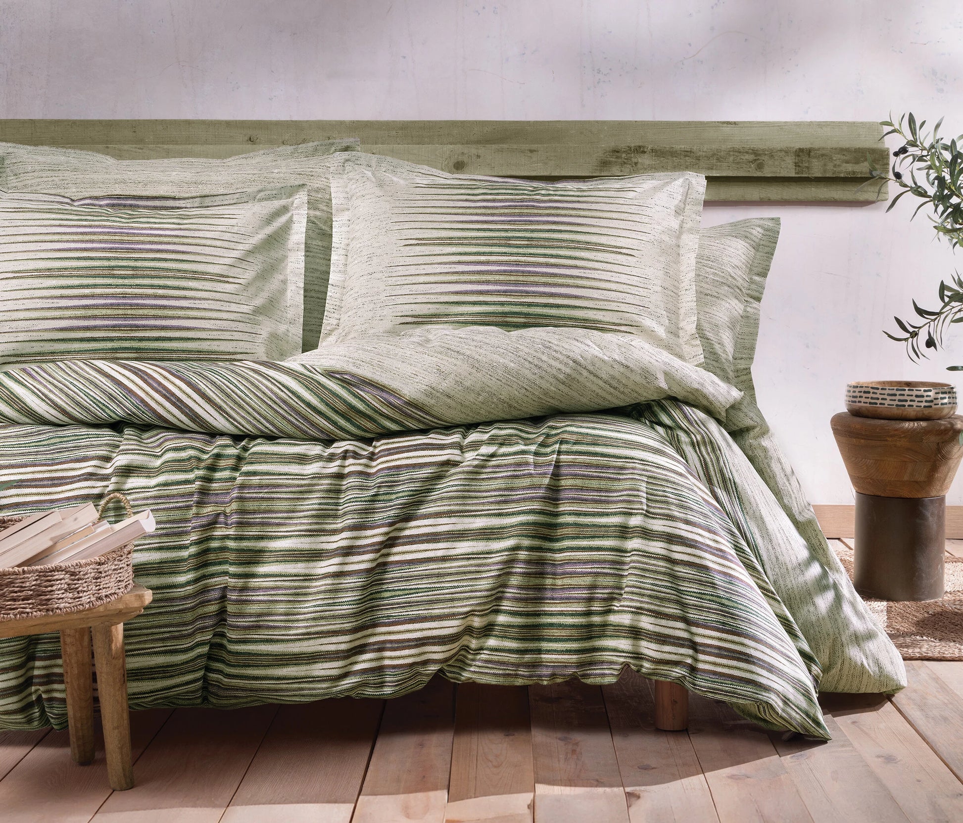 Комплектът Besna в цвят хаки с естествени и успокоителни тонове внася уют и елегантност в спалнята. Неговите нежни нюанси създават спокойна и хармонична атмосфера, идеална за релакс и комфортен сън.