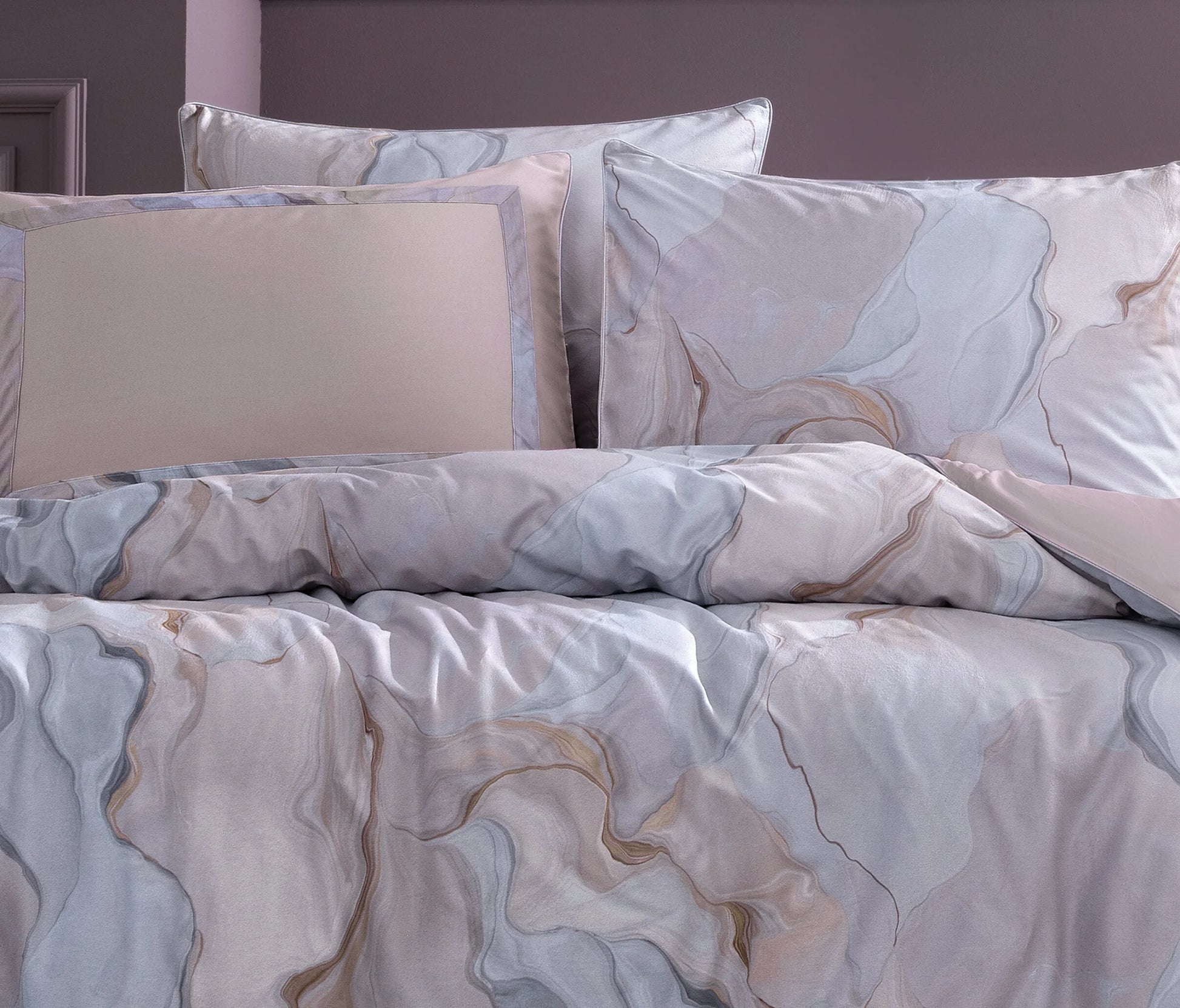 Спалният комплект носи усещане за спокойствие в спалнята с нежната си цветова хармония. Завършва дизайна си с изчистени и елегантни десени. Благодарение на кадифено-сатенената си материя оставя усещане за мекота и лукс. С кадифената материя от горната страна и сатенената текстура от долната страна, спалният комплект предлага стилна и изискана визия.