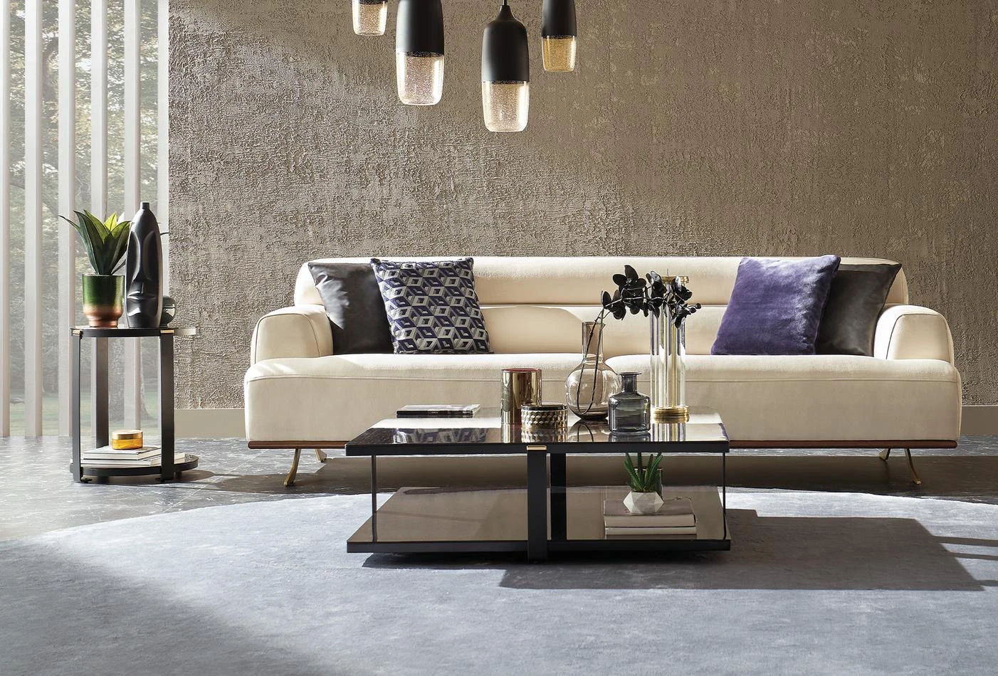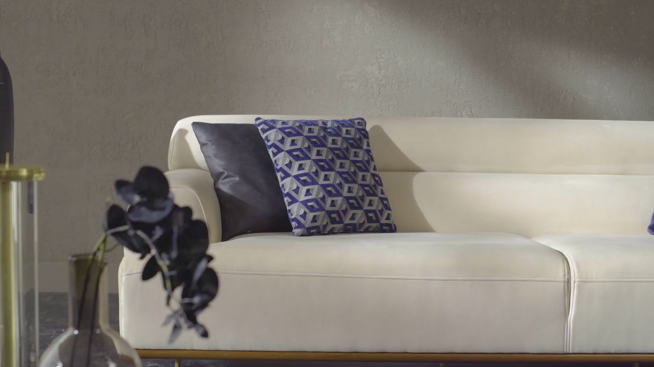 Извеждайки функционалността и комфорта на преден план, модерната дизайнерска линия с динамични детайли, предлага елегантен пример за съвременна декорация. Докато осигурява максимален комфорт със своята многослойна гъбена технология, създава изискан ефект със своята текстура на тъканта. Представлявайки устойчив подход към дизайна със своята дървена конструкция с метална опора, диванът обогатява своя дизайн с богати декоративни възглавници, черна основа/черен крак и основа от орех/златен крак.