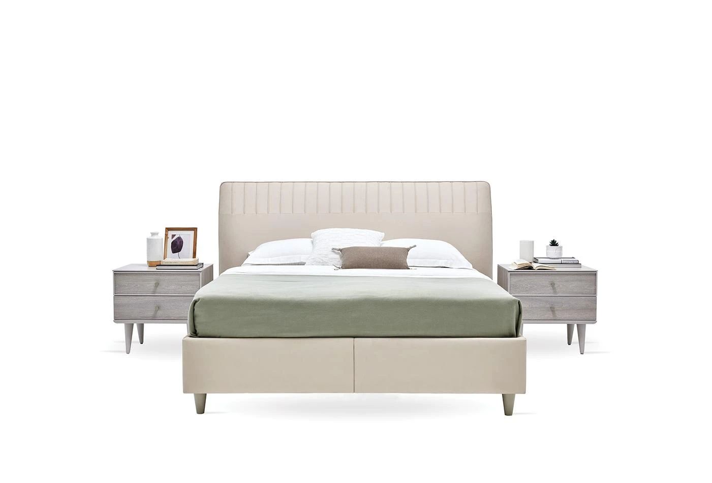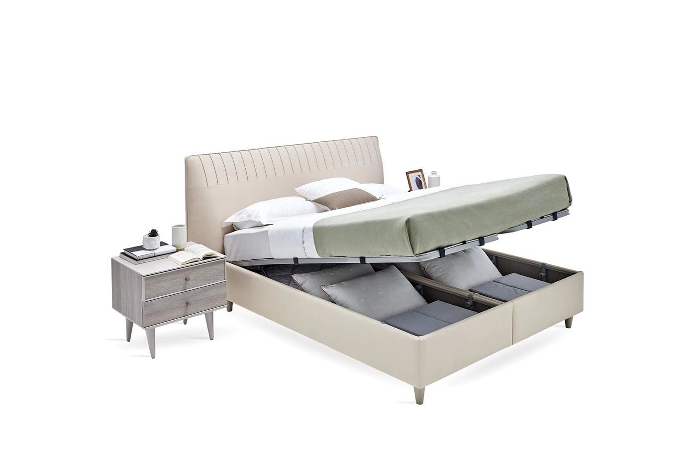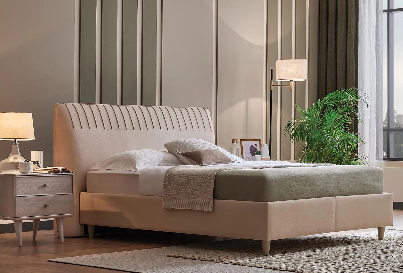 Благодарение на покритата с плат рамка на леглото и удобната структура предлага качествен сън и същевременно обогатява декорацията на спалнята. Докато отразява простата елегантност на естествеността със своята цветова комбинация от светъл дъб и светло бежово, апликацията с фитил върху таблата помага да се добави уникална атмосфера към пространството с иновативни щрихи.