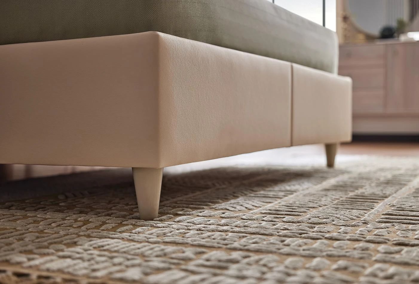 Благодарение на покритата с плат рамка на леглото и удобната структура предлага качествен сън и същевременно обогатява декорацията на спалнята. Докато отразява простата елегантност на естествеността със своята цветова комбинация от светъл дъб и светло бежово, апликацията с фитил върху таблата помага да се добави уникална атмосфера към пространството с иновативни щрихи.
