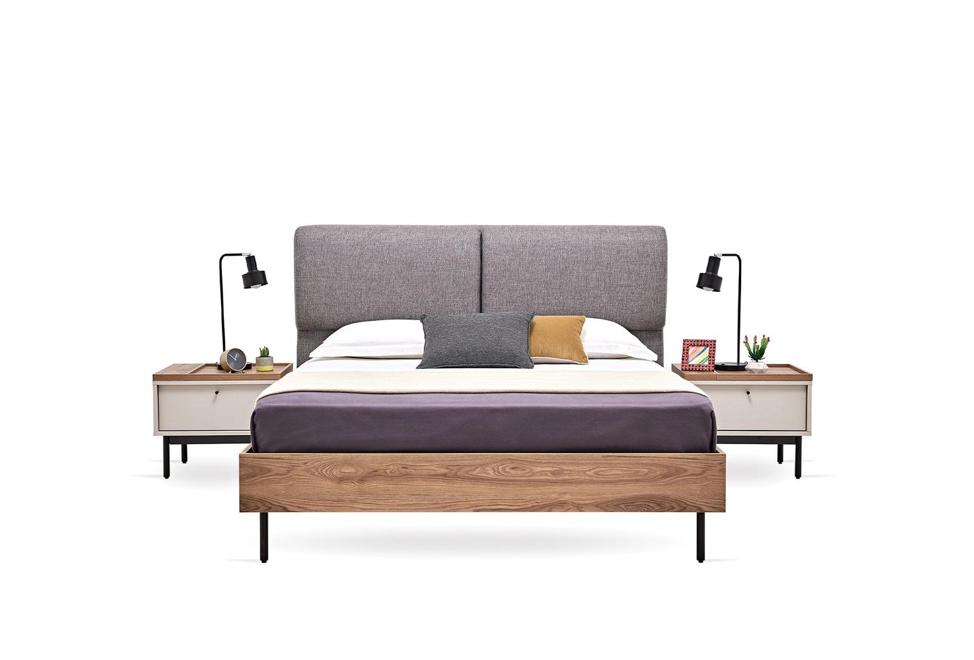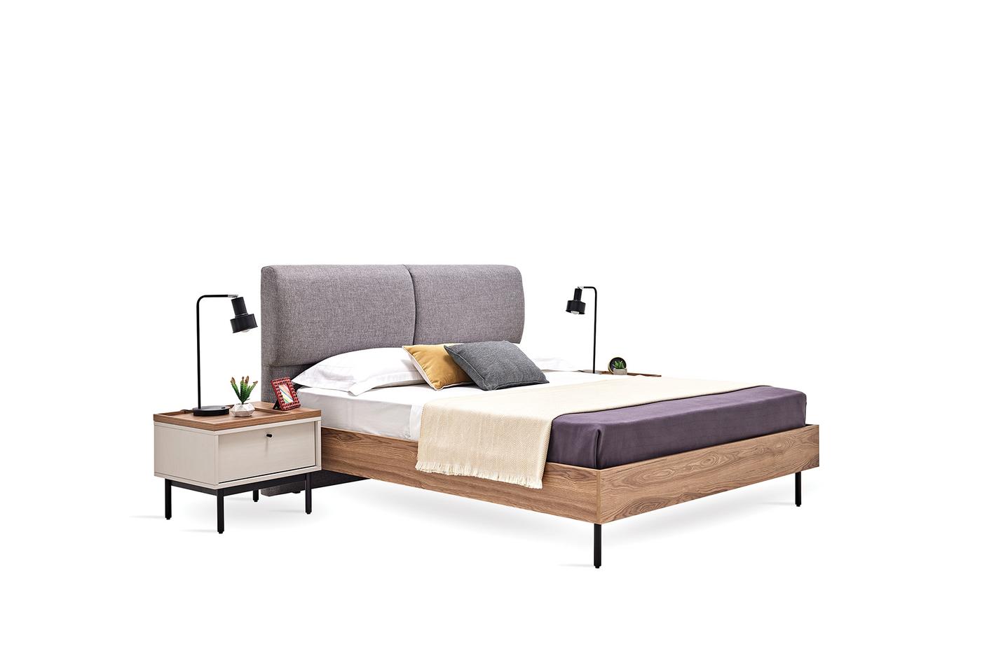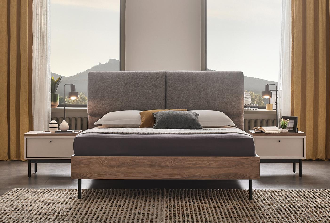 Модерните изчистени линии са откриват и в спалнята на серия Loreto. Леглото е тапицирано в тъкана дамаска и разполага с голямо складово пространство. Базата е елегантно подчертана с черни метални крачета в индустриален стил. Опция за избор между няколко цвята.