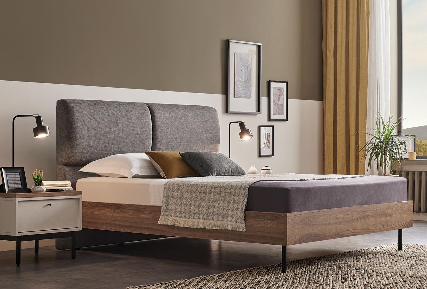 Модерните изчистени линии са откриват и в спалнята на серия Loreto. Леглото е с тапицирана табла в тъкана дамаска, базата е елегантно подчертана с черни метални крачета в индустриален стил. Опция за избор между няколко цвята.