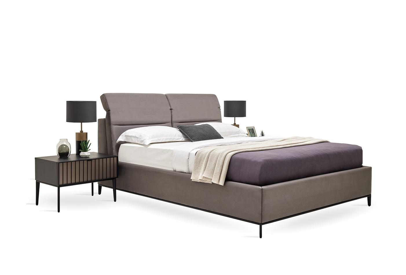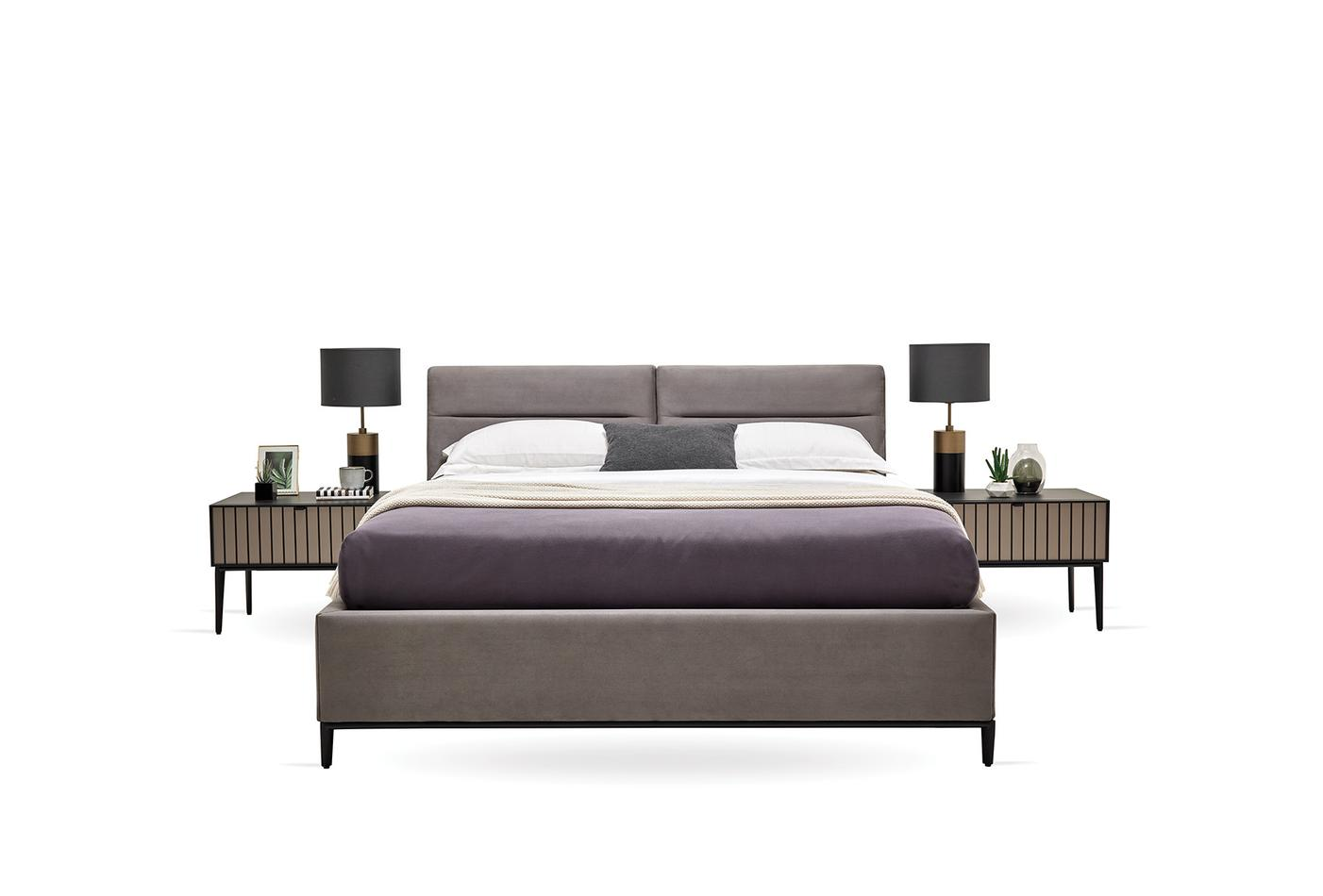 Леглото от колекцията има необичайна функционална табла. Оборудван е с 4-степенен механизъм за регулиране на наклона на таблата, което прави леглото още по-удобно и привлекателно. Краката на леглото са в матово черно, за да паснат на цялата колекция.Със своя модерен и луксозен външен вид ще се впише във всеки интериор.