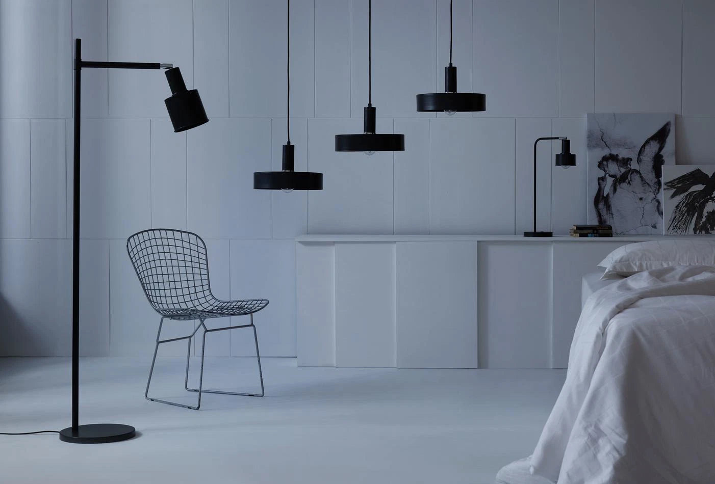 - Може да се съчетае с висящи лампи и настолна лампа