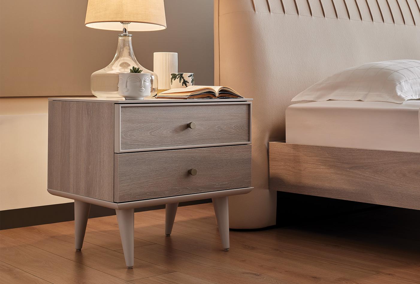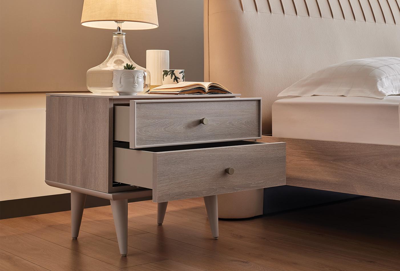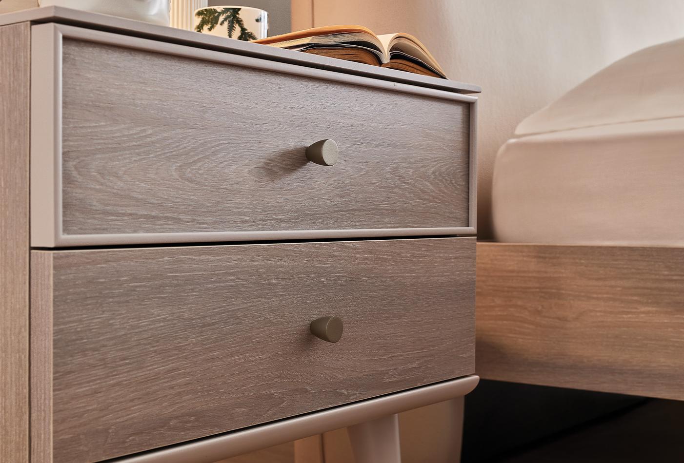 Със своята цветова комбинация от светъл дъб и светло бежово придава естетичен вид на пространството в което се намира. Комбинирайки простота с елегантност, дизайнът променя атмосферата на домовете. Металният дизайн на дръжката в цвят никел, който е съвместим с колекцията, придава елегантна позиция.