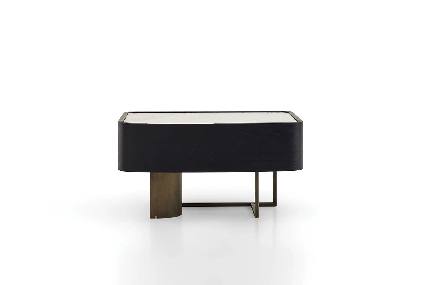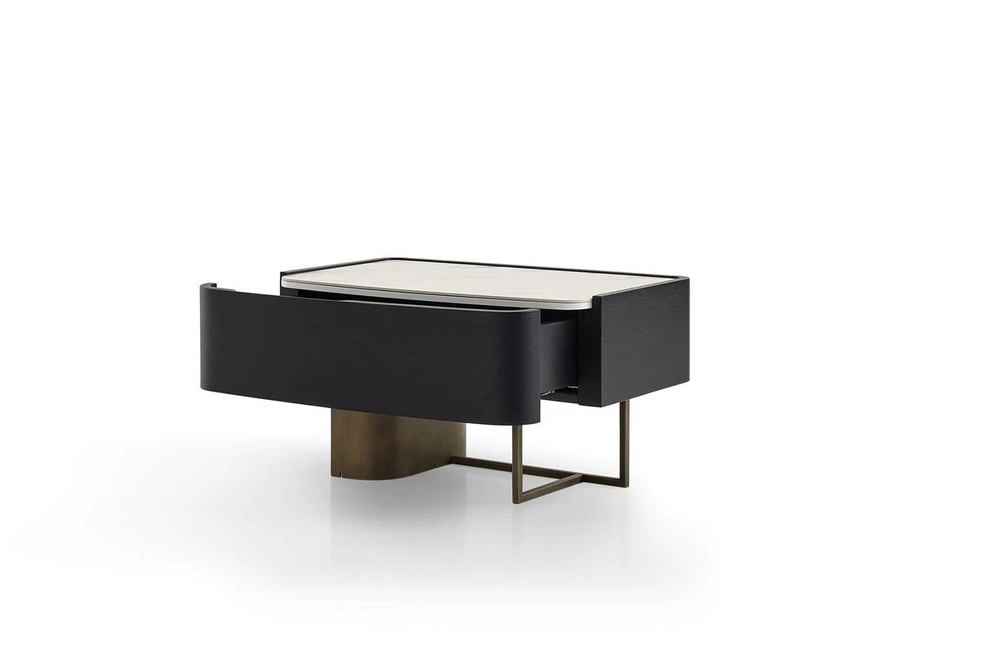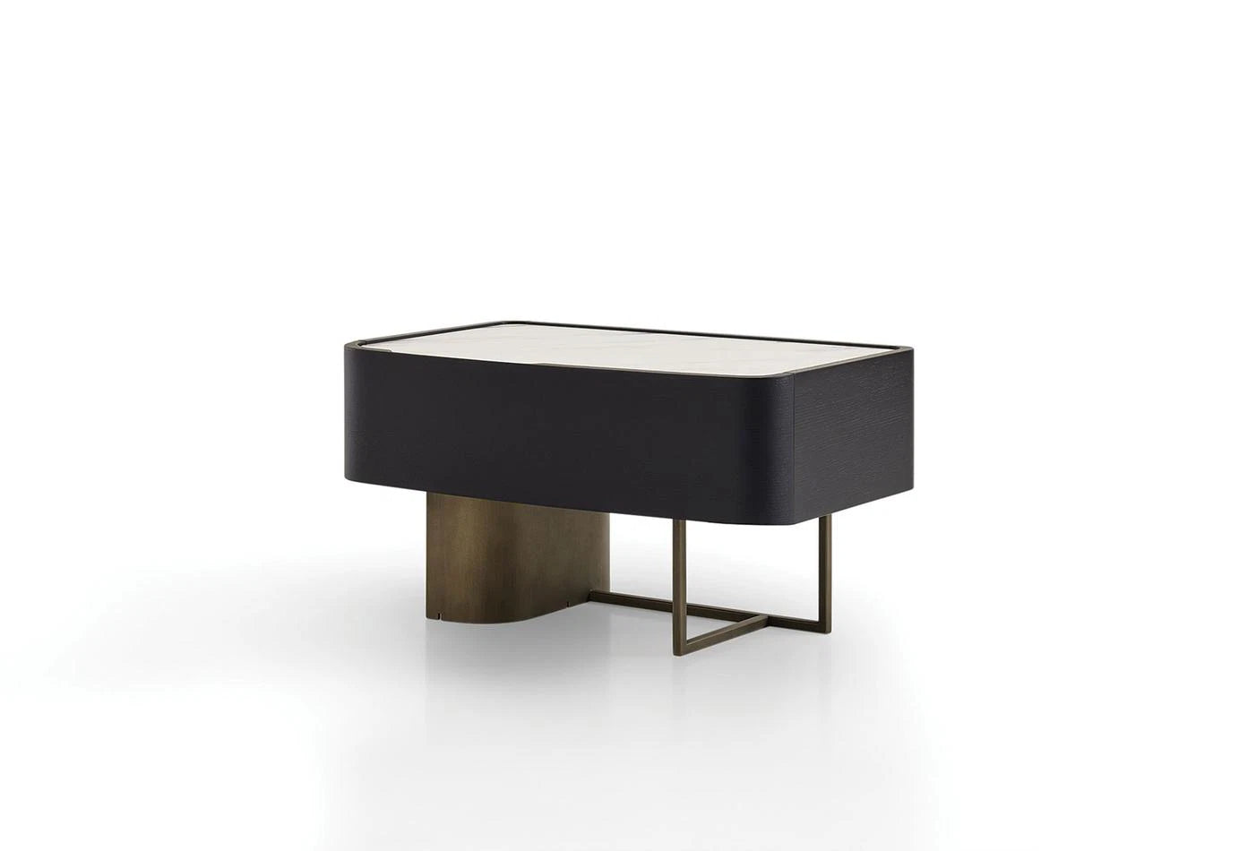 Suva е продукт от серията Visions 2024 и се отличава с модерните си заоблени линии и елегантен дизайн. Горната повърхност предлага луксозно докосване със своето керамично покритие, наподобяващо мрамор. Черният цвят на естествения фурнир върху МДФ придава на нощното шкафче естетичен и стилен вид.