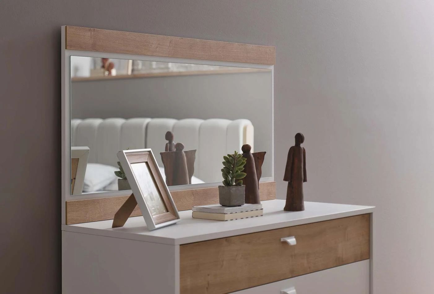 Подкрепяйки модерната концепция за дизайн с естествения вид, предлаган от дървените детайли, огледалото носи със себе си новаторска атмосфера с елегантни нотки. Предлага безопасно и стилно изживяване при използване със своята здрава структура и естествено огледало. Добавя визуално богатство към вашата спалня с цвета на рамката бял дъб.