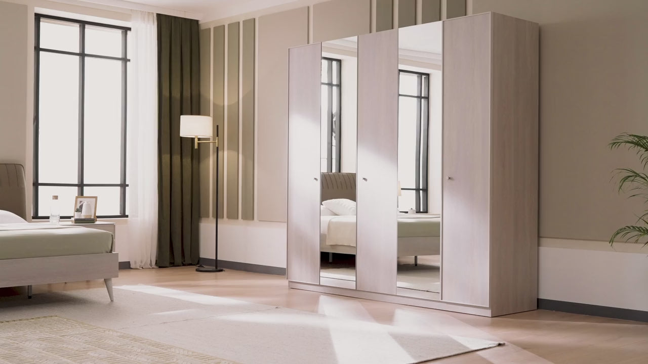 Отличаващ се с минималистичен дизайн добавя модерен щрих, като придава светъл и приветлив вид на пространствата, в които се намира. Проектиран в комбинация от светъл дъб и светло бежово. Огледална апликация в естествен цвят върху вратата на шкафа. Внесена система на панти със самозабавяне. Стилен интериор с просторни и удобни места за съхранение.