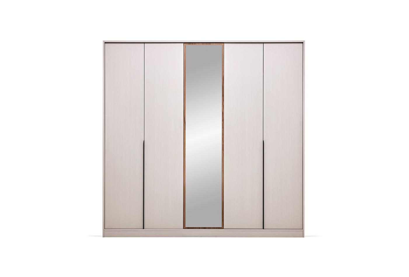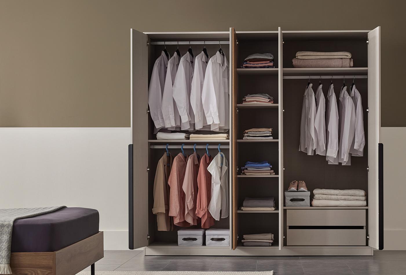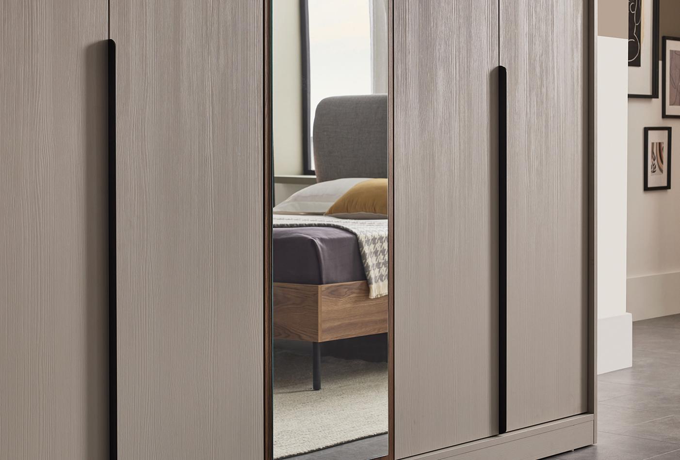 Перфектното цветово съчетание и текстурите на различните елементи, в комбинация с огледалото от закалено стъкло в гардероба придават усещане за пространство във Вашата спалня. А зад вратите се открива завидно място за съхранение с функционало разпределение.