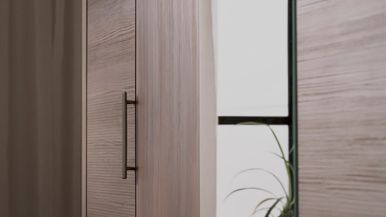 - Предлага топъл орехов цвят с дълбока дървесна текстура, където естествеността е на преден план с модерен вид на дърво и геометрични конструкции