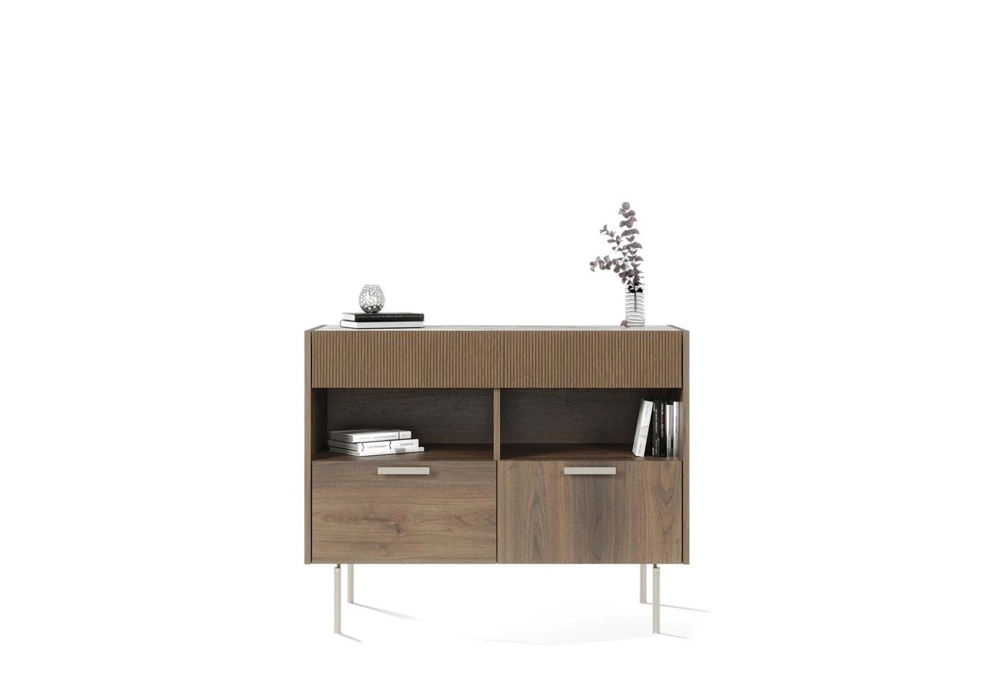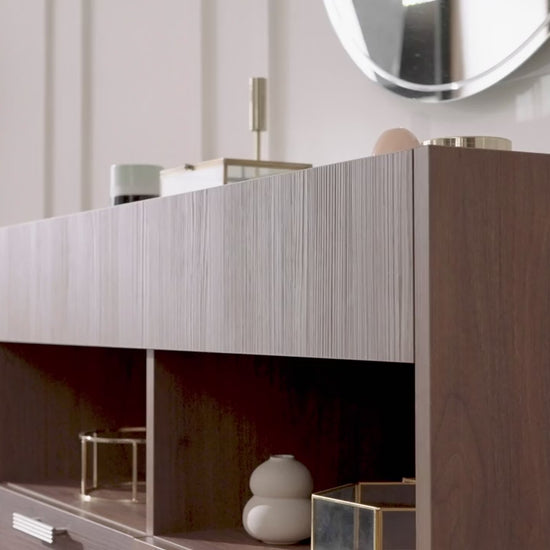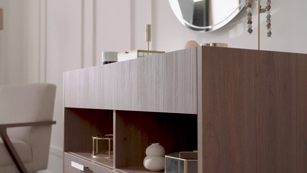 - Предлага топъл орехов цвят с дълбока дървесна текстура, където естествеността е на преден план с модерен вид на дърво и геометрични конструкции