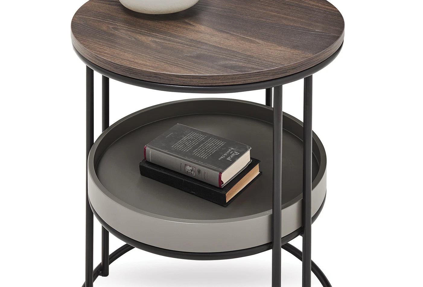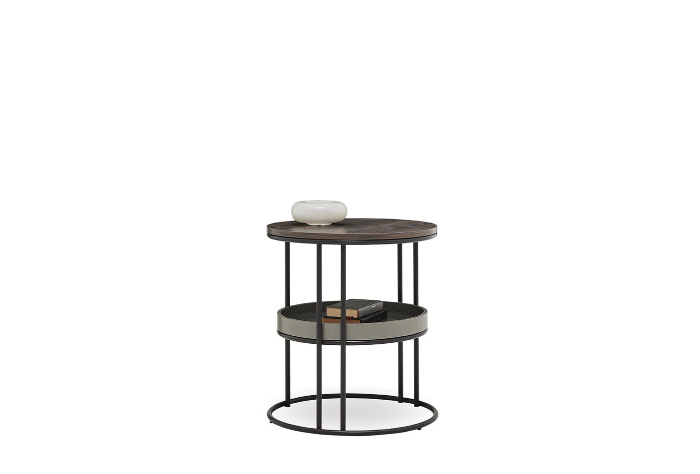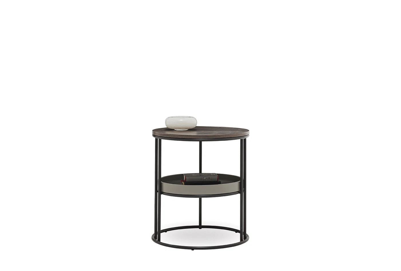Динамично допълнение с поразителния си цвят на орех, привлича вниманието с кръглата си форма, стилен и функционален дизайн с рафтове.