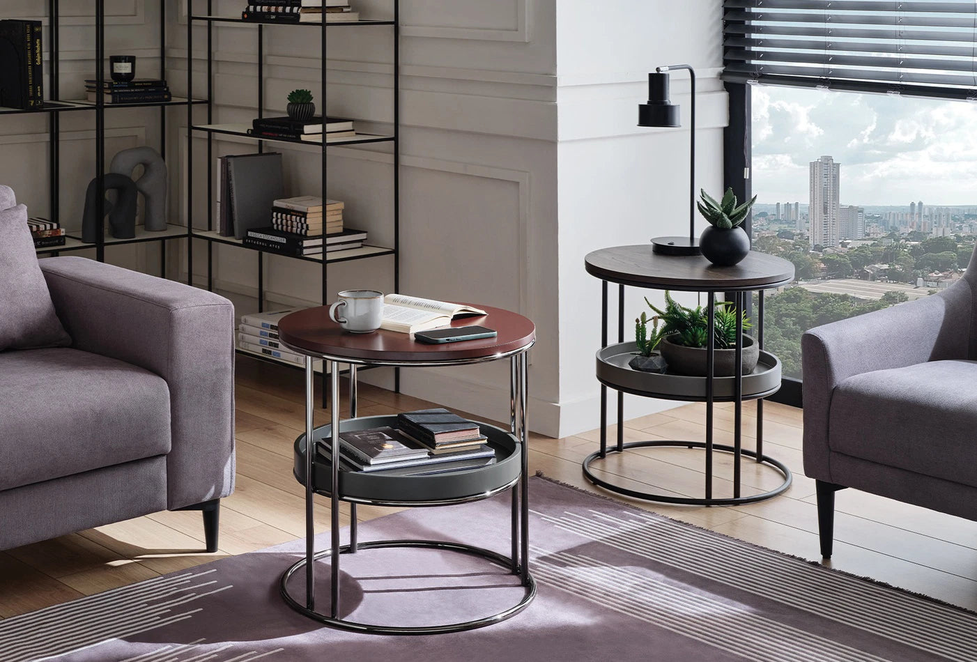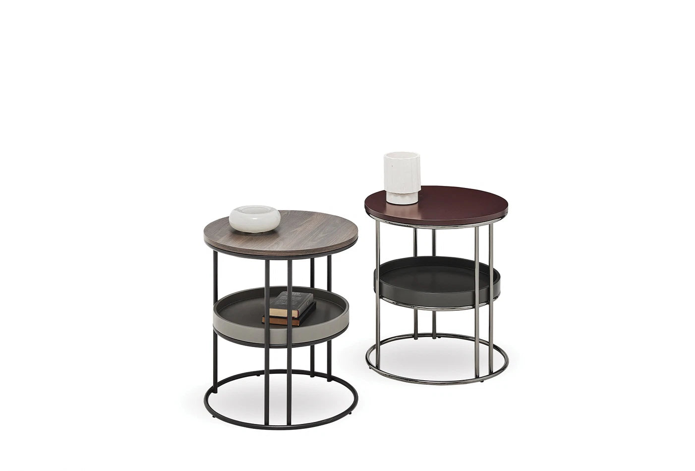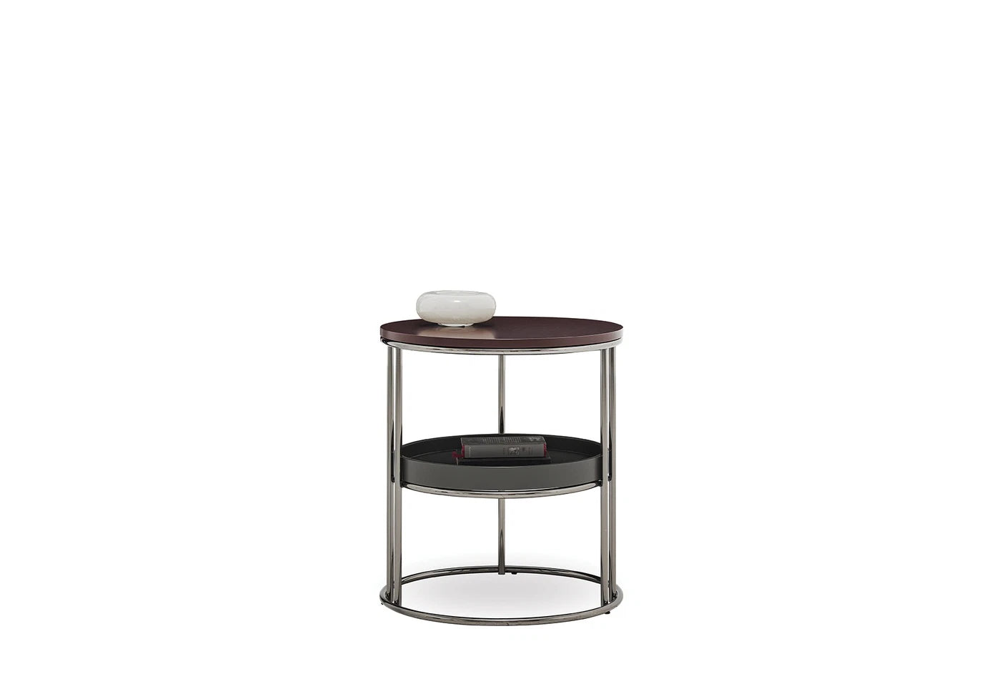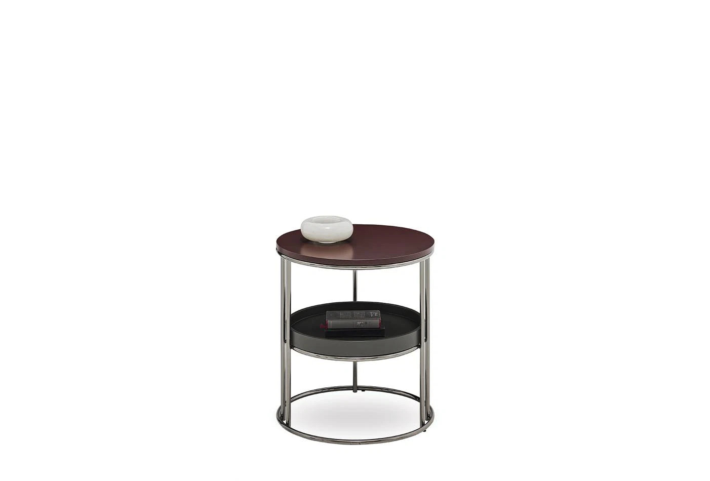Динамично допълнение с поразителния си цвят на орех, привлича вниманието с кръглата си форма, стилен и функционален дизайн с рафтове.