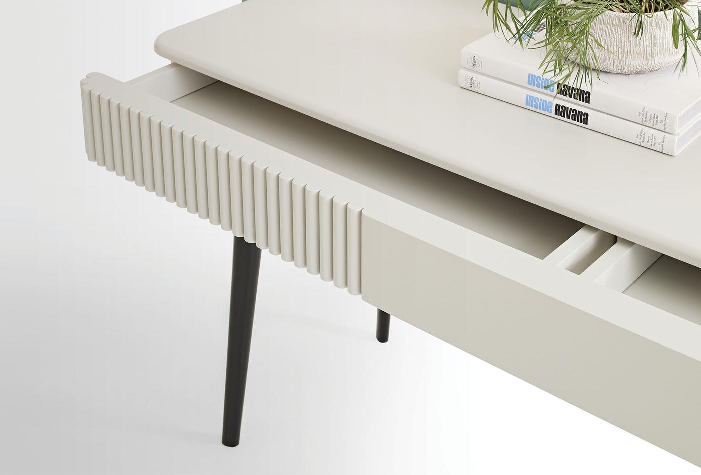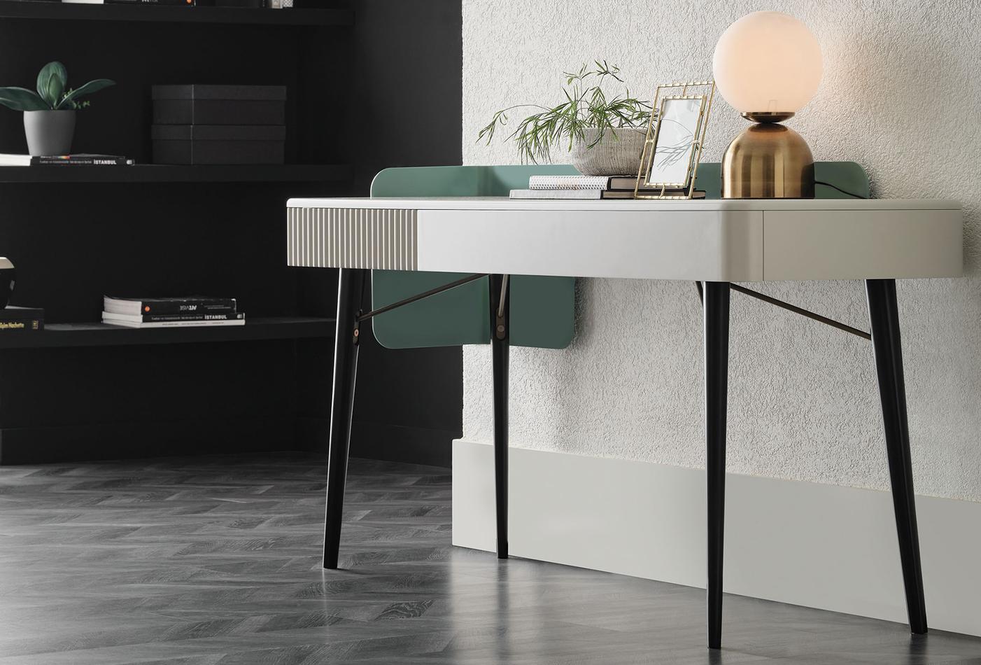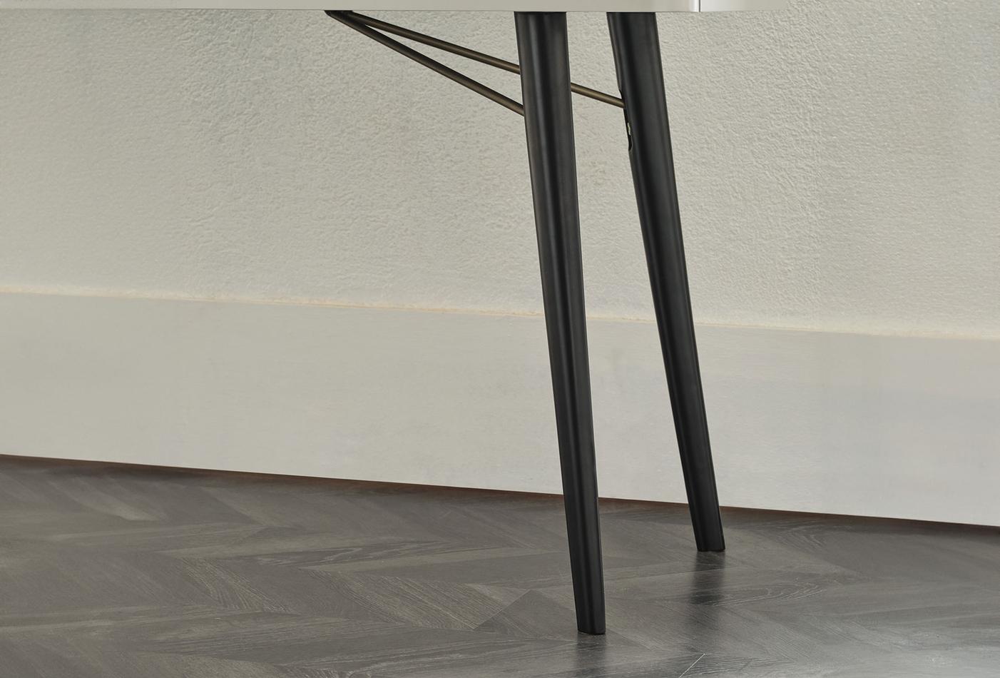 Предлага елегантен дизайн, оборудван с изискани детайли. Съчетавайки издръжливост и елегантност с използването МДФ материал и метален корпус, тя прави уникално впечатление с дървените си краката.