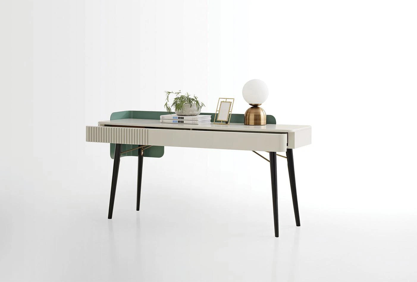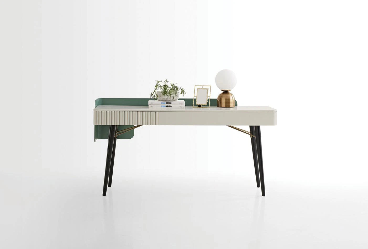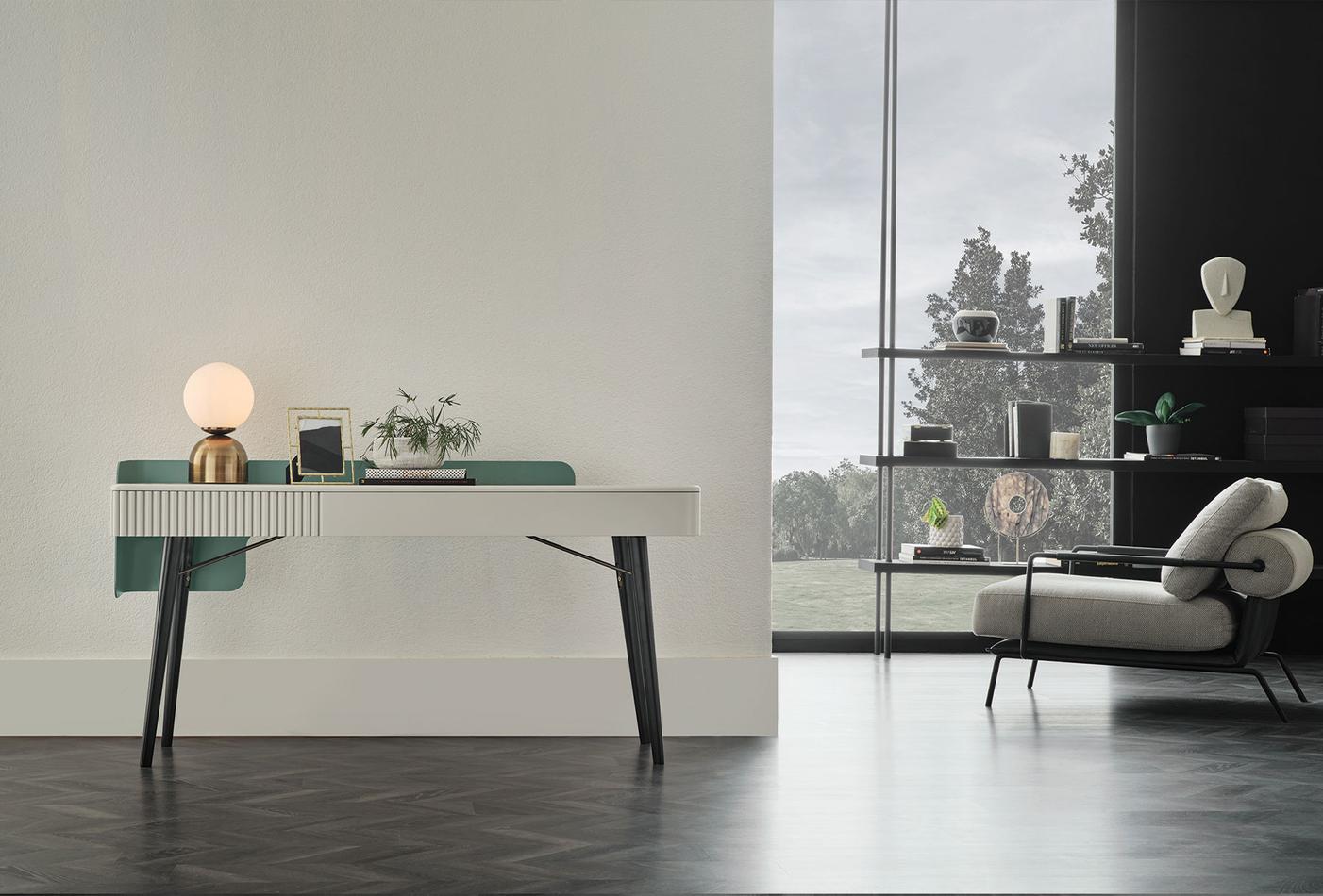 Предлага елегантен дизайн, оборудван с изискани детайли. Съчетавайки издръжливост и елегантност с използването МДФ материал и метален корпус, тя прави уникално впечатление с дървените си краката.