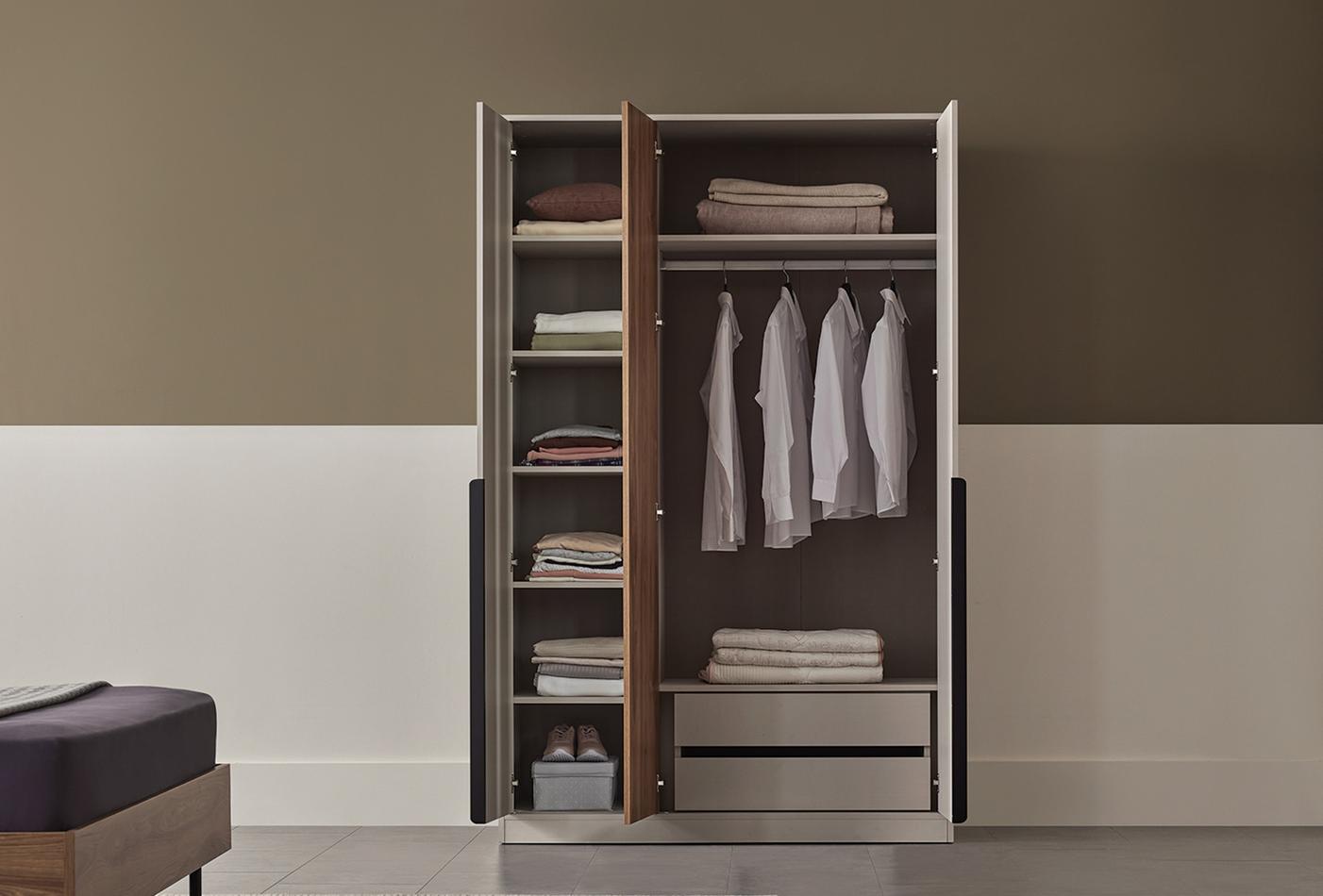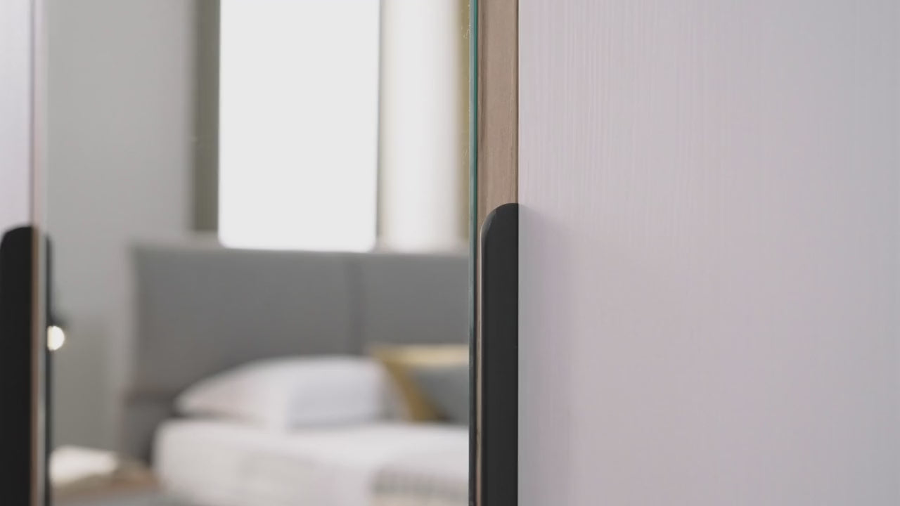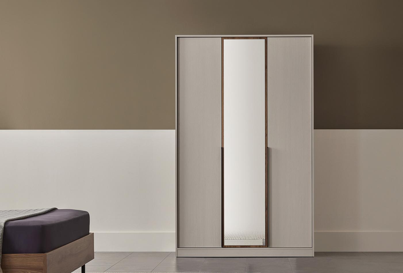 Перфектното цветово съчетание и текстурите на различните елементи, в комбинация с огледалото от закалено стъкло в гардероба придават усещане за пространство във Вашата спалня. А зад вратите се открива завидно място за съхранение с функционало разпределение.