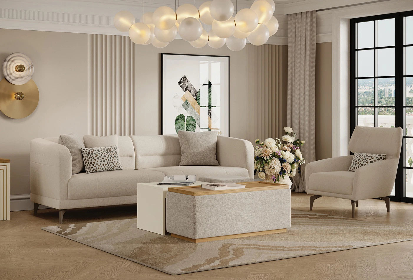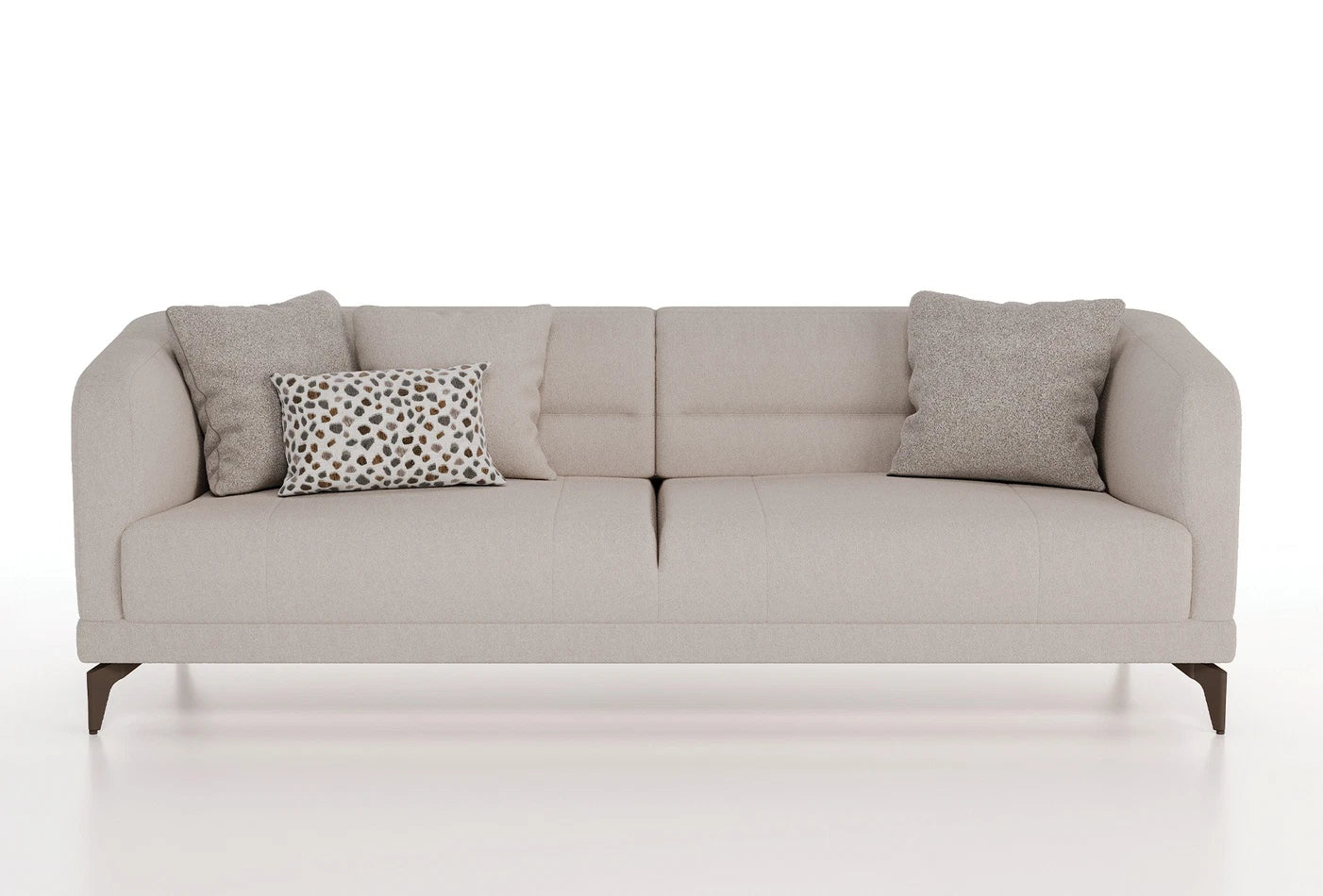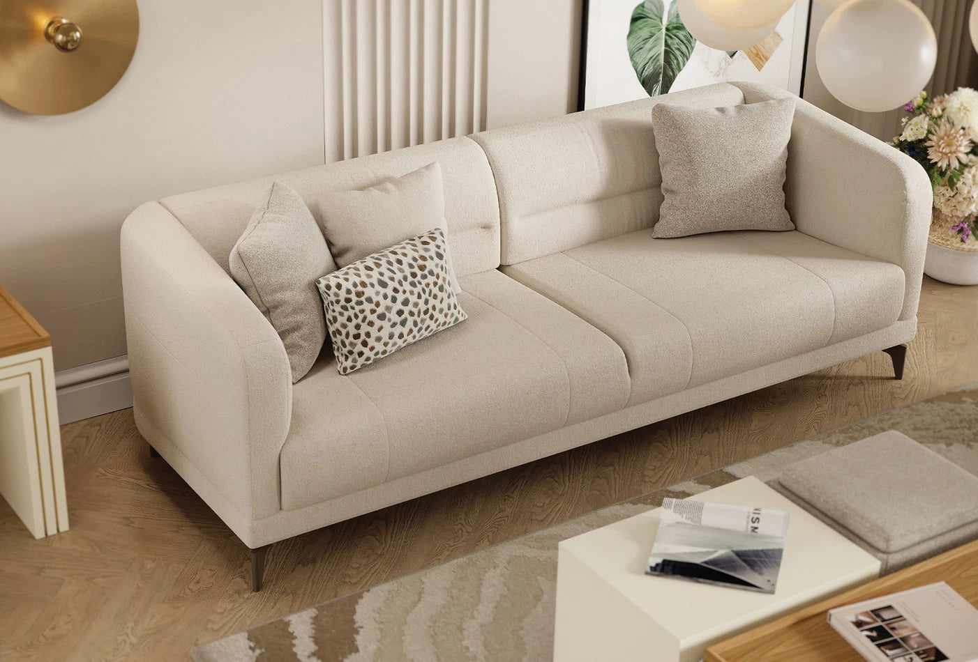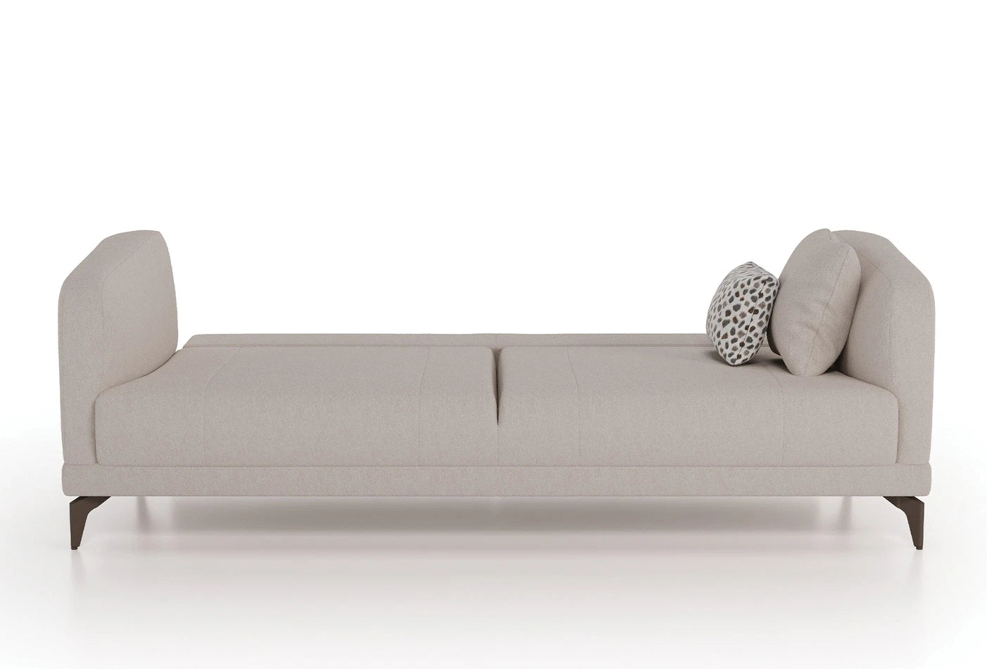 Триместният разтегателен диван Marsana изпъква със своите изчистени линии и съвременен дизайн. В бежови тонове и с декоративни възглавници, той придава модерна елегантност на всяко жилищно пространство. Благодарение на механизма за разгъване, диванът лесно се превръща в удобно легло при нужда, а четирите възглавници осигуряват комфортно изживяване при сядане. Високите крака улесняват почистването, а материята, която се почиства лесно, прави ежедневната употреба още по-практична.