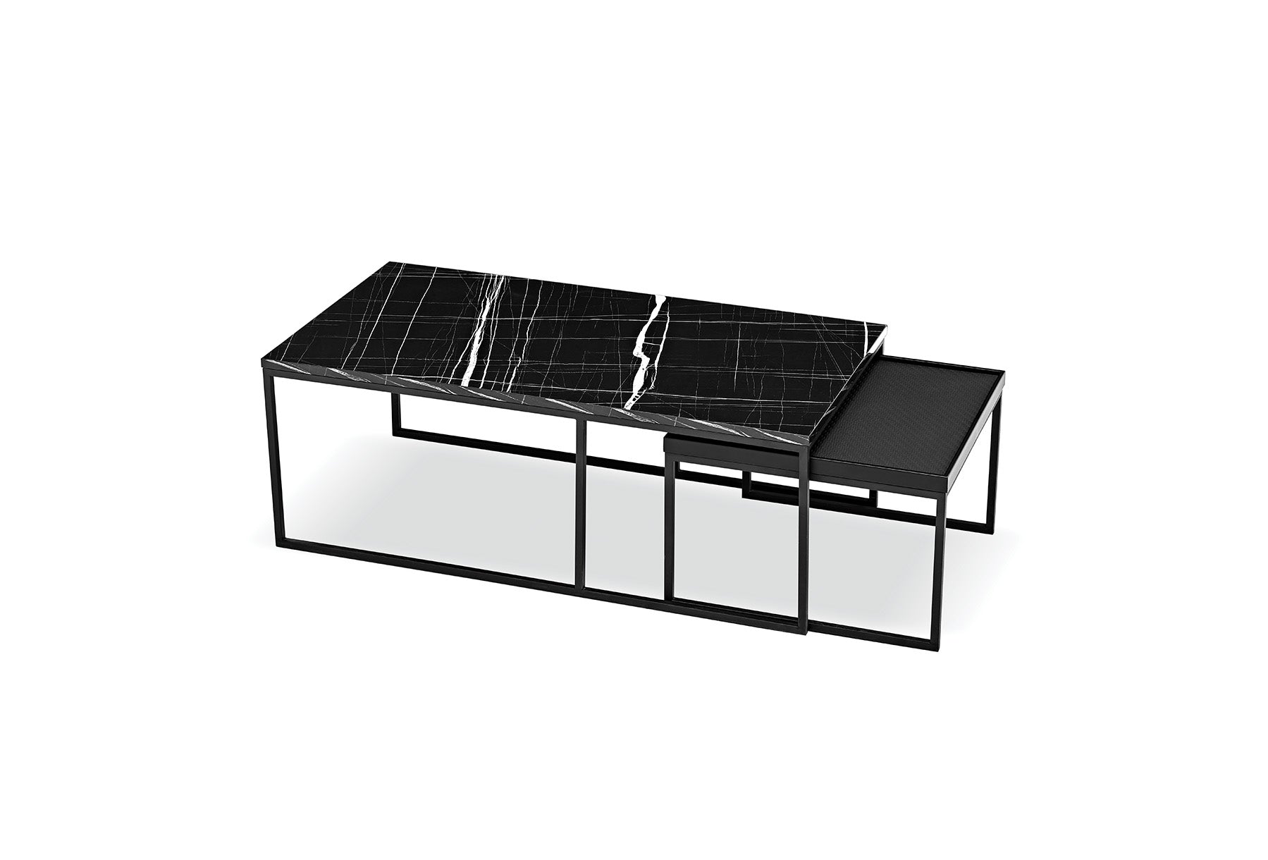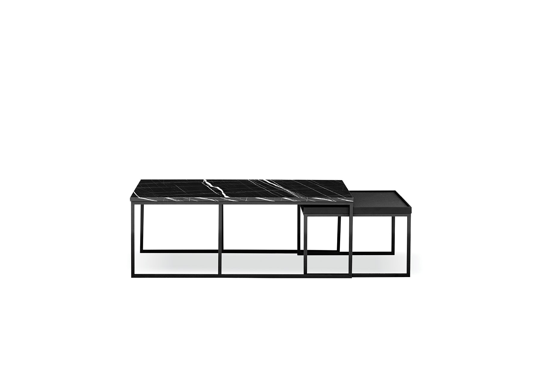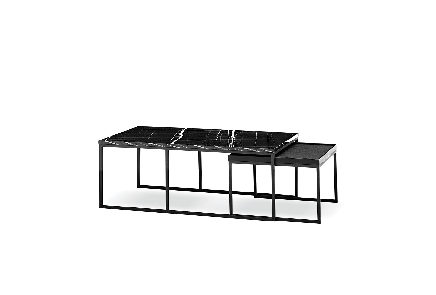 Мраморна шарка на правоъгълната масичка за кафе и кожена шарка на квадратната масичка за кафе в комбинация с матово-черни метални крака