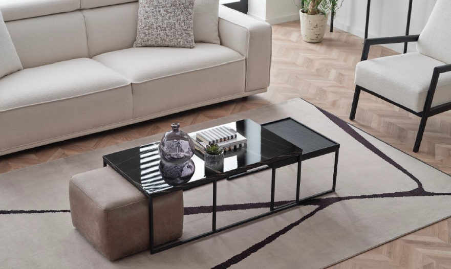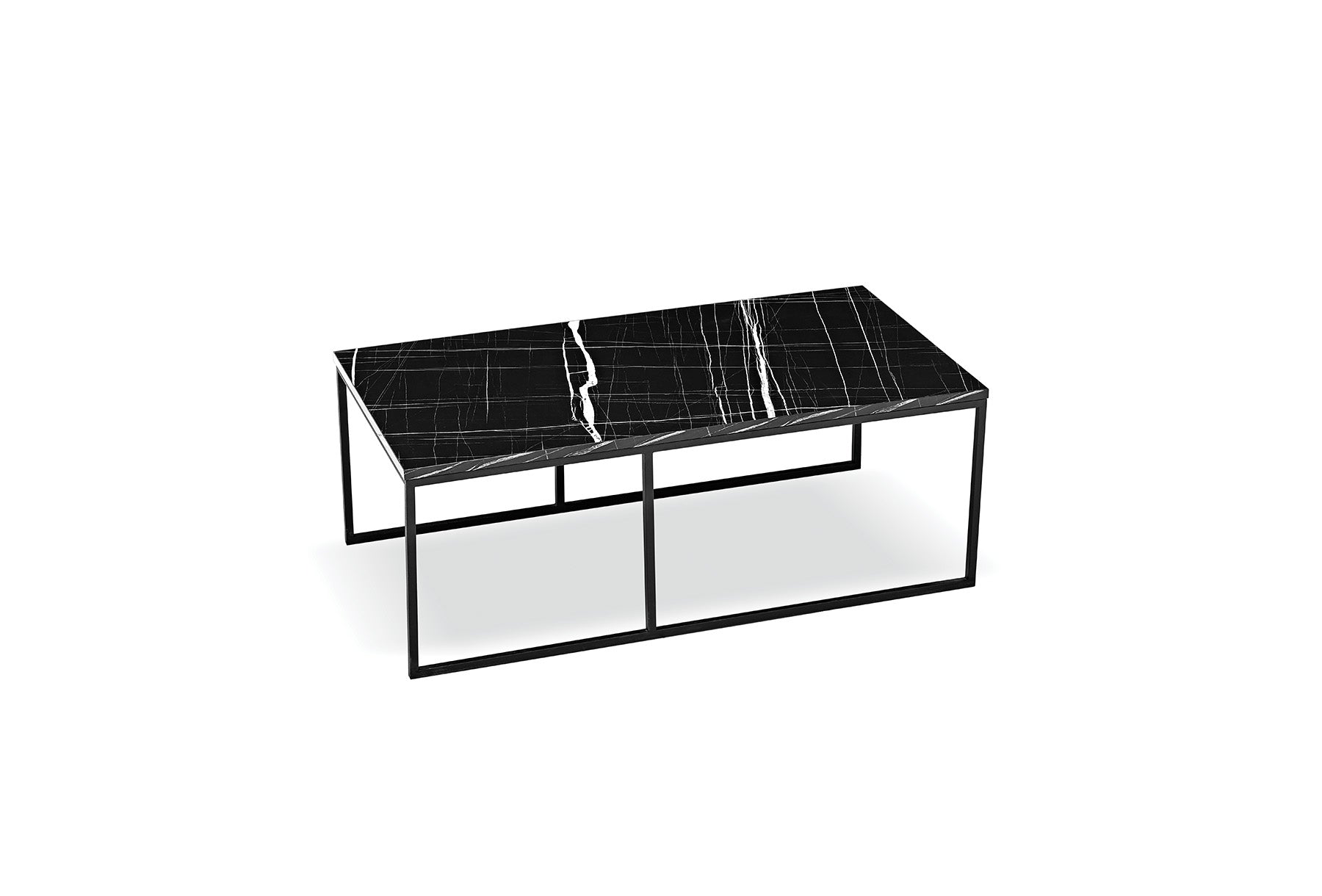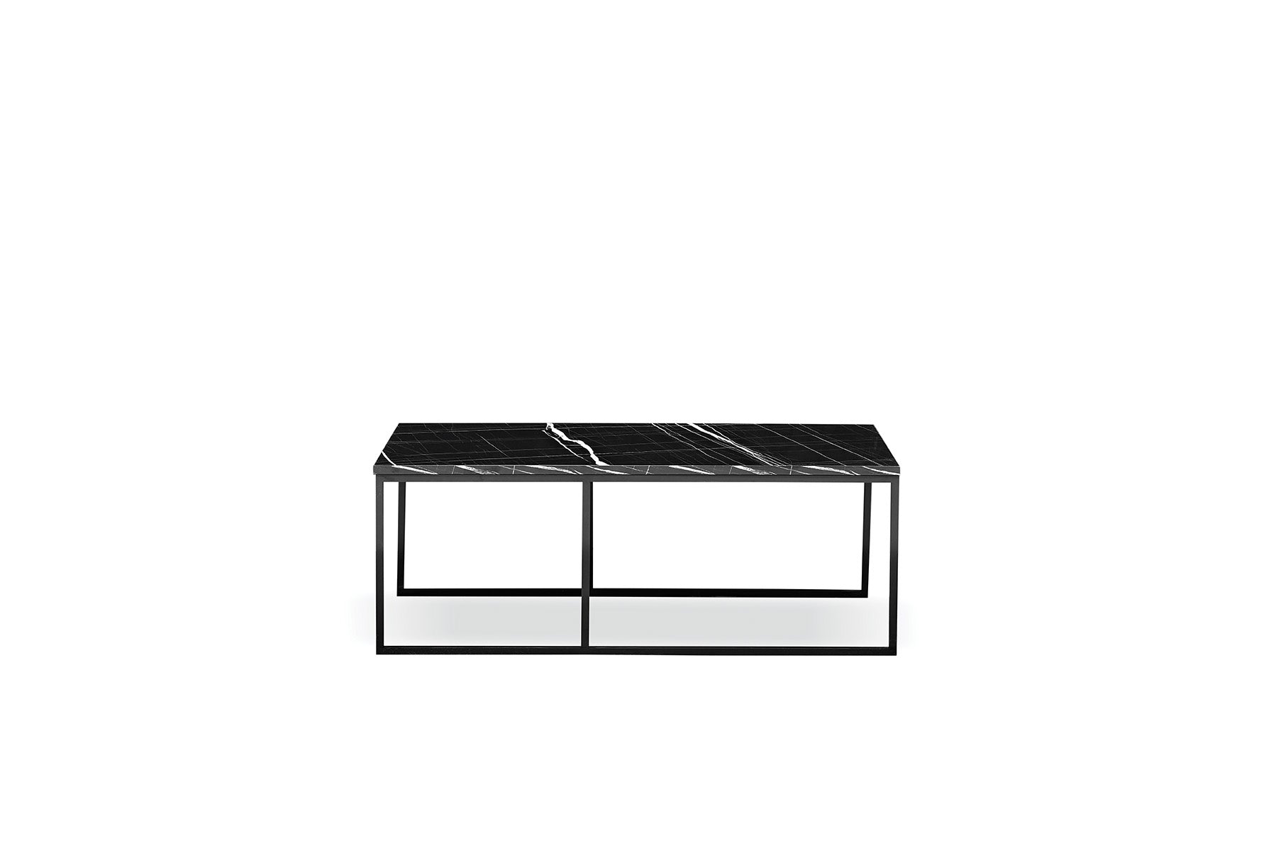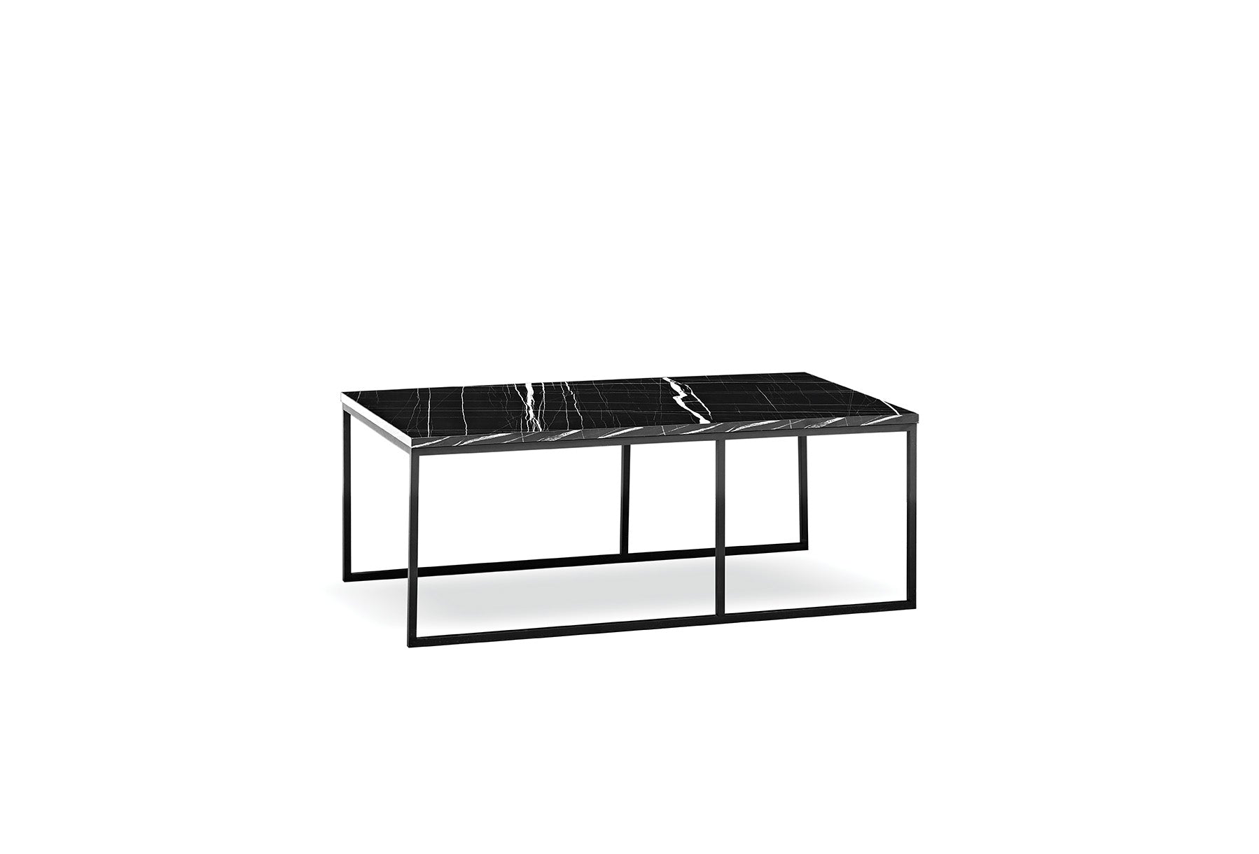 Мраморна шарка на правоъгълната масичка за кафе и кожена шарка на квадратната масичка за кафе в комбинация с матово-черни метални крака