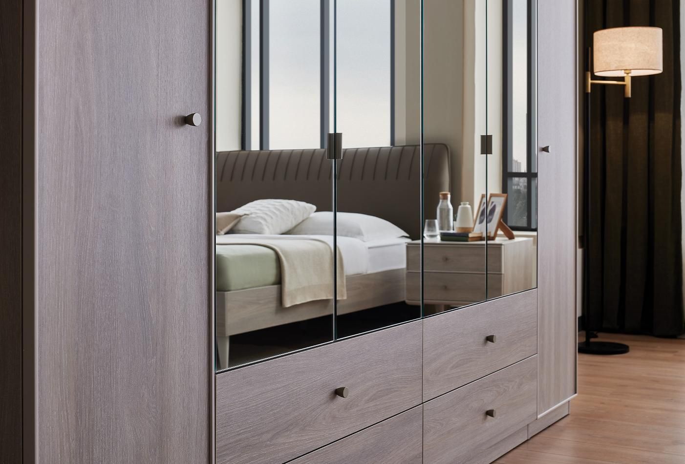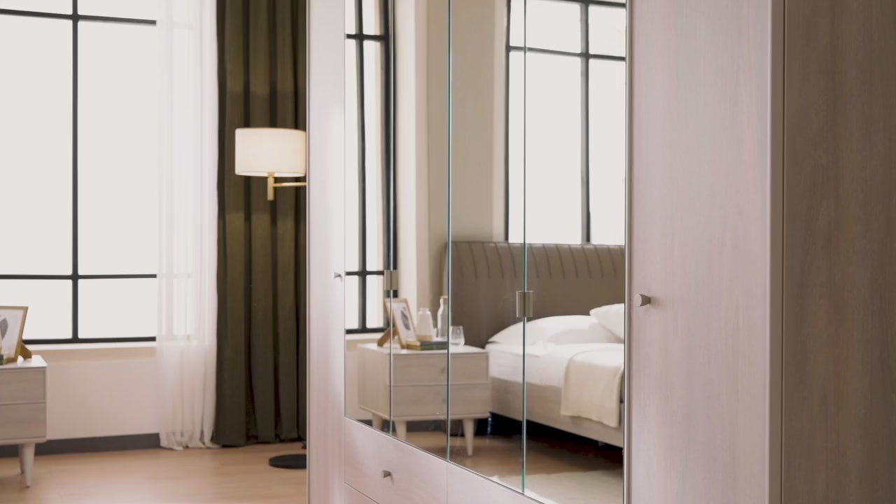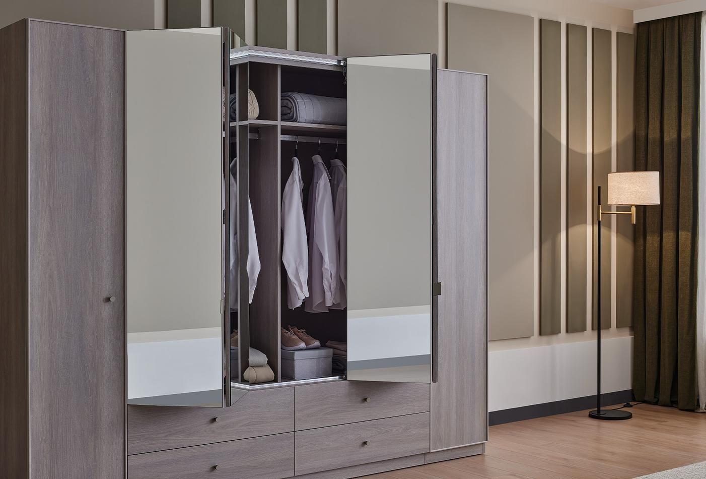 Привличайки вниманието с минималистичния си дизайн добавя модерен щрих, като придава светъл и приветлив вид на пространствата, в които се намира. Проектиран в цветова комбинация от светъл дъб и светло бежово. Привлича вниманието с огледалната си апликация в естествен цвят и профилни детайли, които допълват дизайна, като същевременно извеждат елегантността на преден план с дизайна на дръжките си в цвят метален никел в хармония с колекцията апликацията на акордеон. Предлага възможност за съхранение на различни видове предмети с 4 приложения за чекмеджета. По този начин може да се получи допълнително място за много артикули.