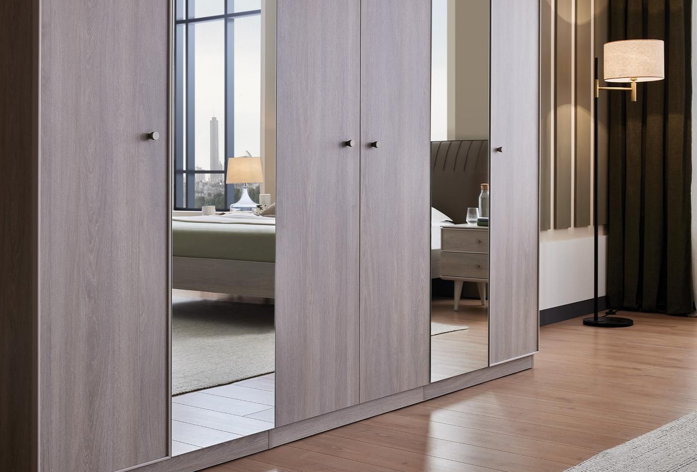 Отличаващ се с минималистичен дизайн добавя модерен щрих, като придава светъл и приветлив вид на пространствата, в които се намира. Проектиран в комбинация от светъл дъб и светло бежово. Огледална апликация в естествен цвят върху вратата на шкафа. Внесена система на панти със самозабавяне. Стилен интериор с просторни и удобни места за съхранение.