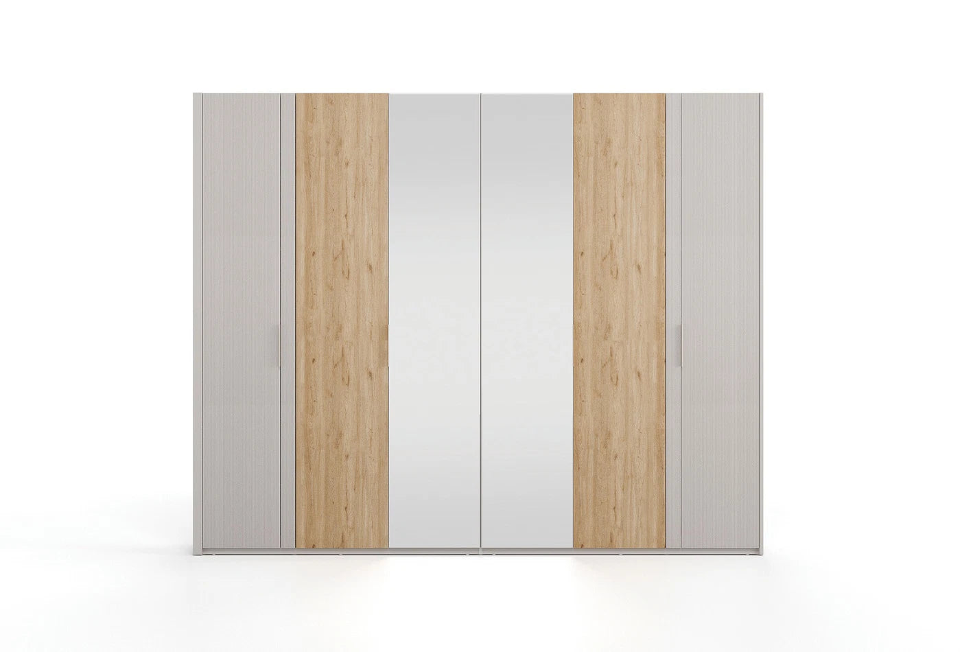 Със своята комбинация от естествен дъб и бежов цвят внася топла и елегантна атмосфера в спалните ви. Специалните шарени текстури и огледалата в естествен цвят, използвани при вратите, подчертават естетическата стойност на дизайна, а металните дръжки от инокс добавят модерно докосване.