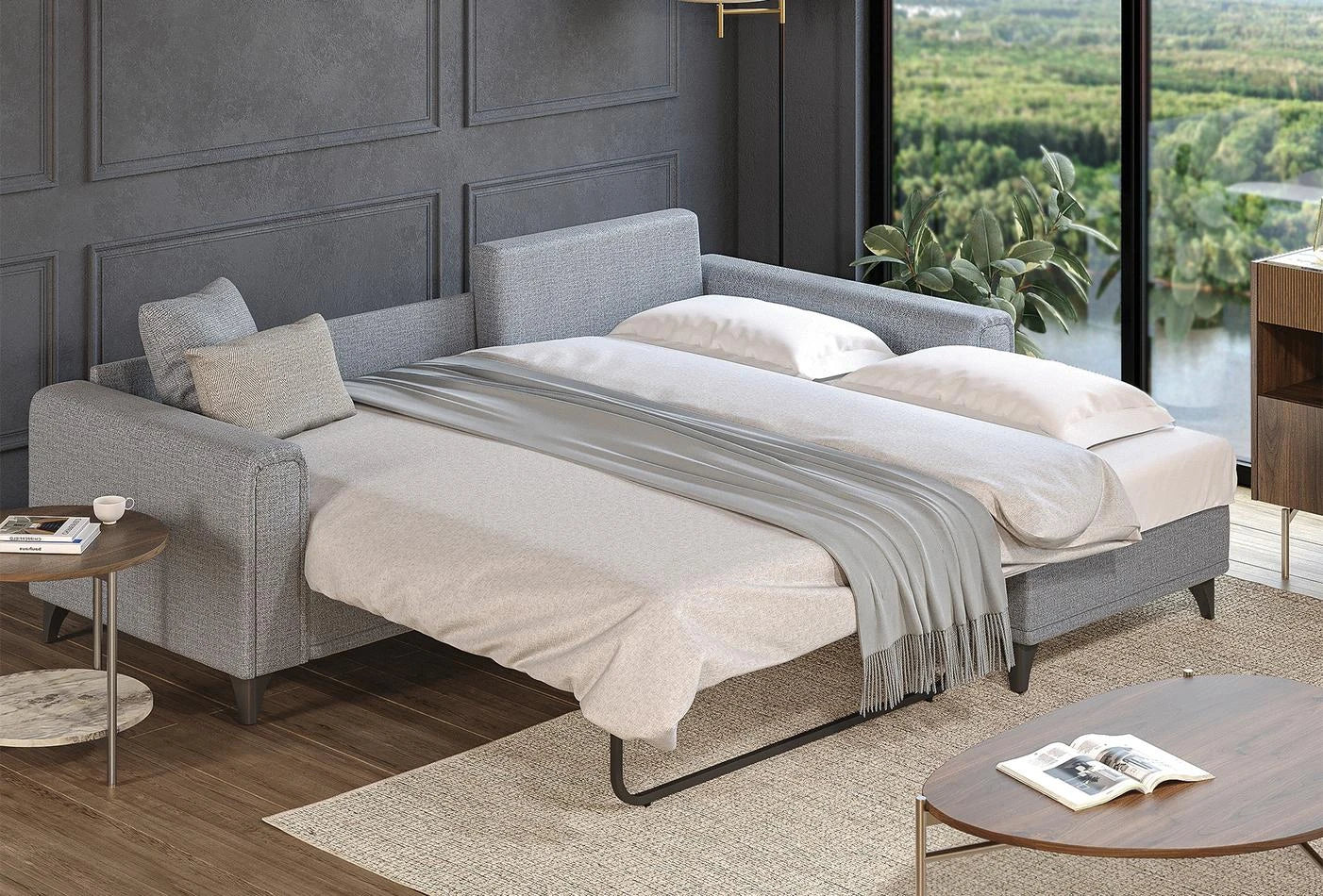 Ъгловият диван може лесно да се превърне в голямо легло, също така предлага допълнително пространство за съхранение .