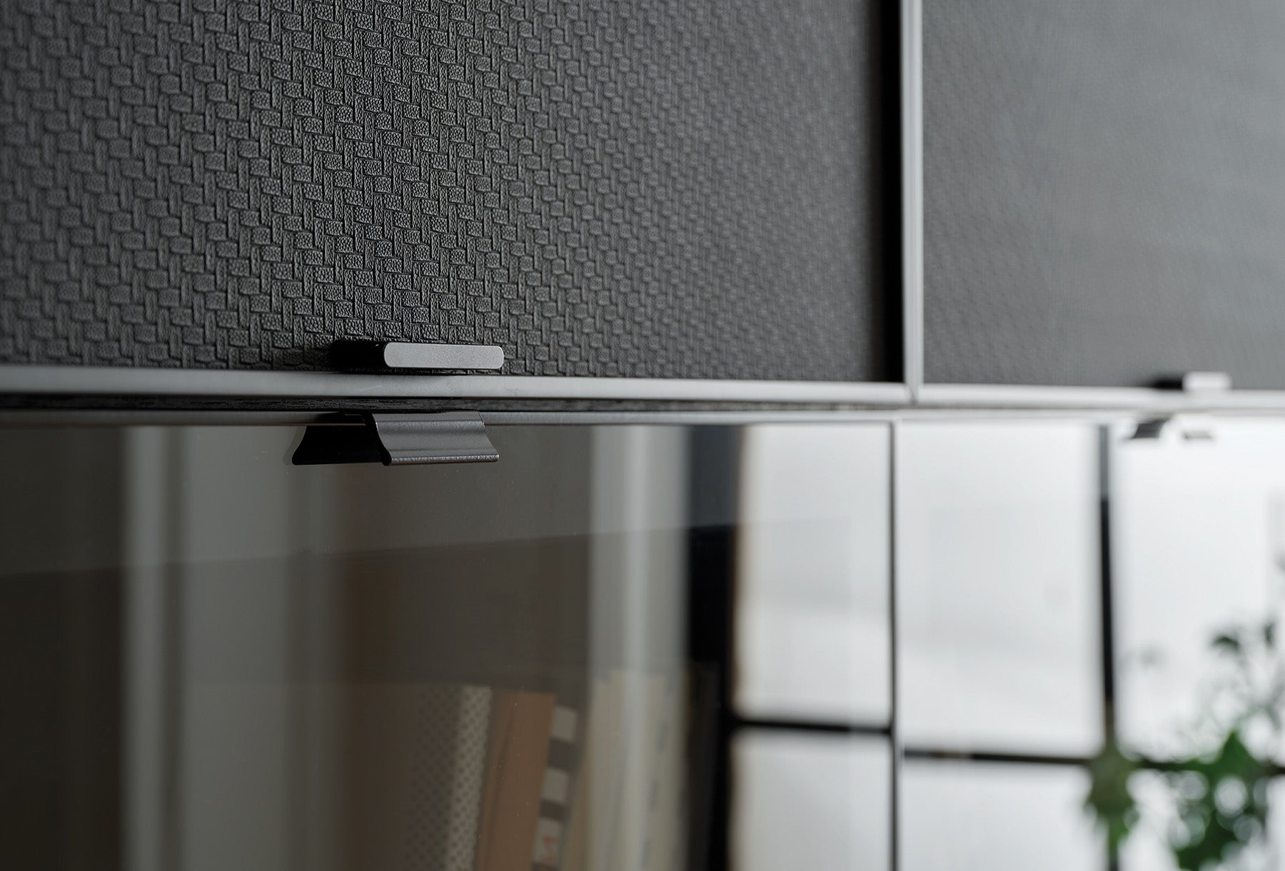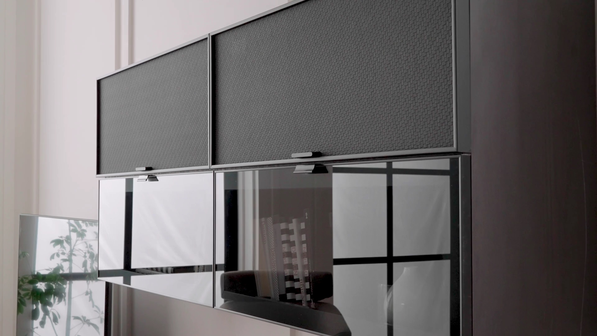 Благодарение на комбинацията от стъкло, черна профилна рамка, метален ефект върху корпуса, черни матирани метални дръжки и кожени вложки, шкафът подчертава елегантността и изтънчеността на интериора.